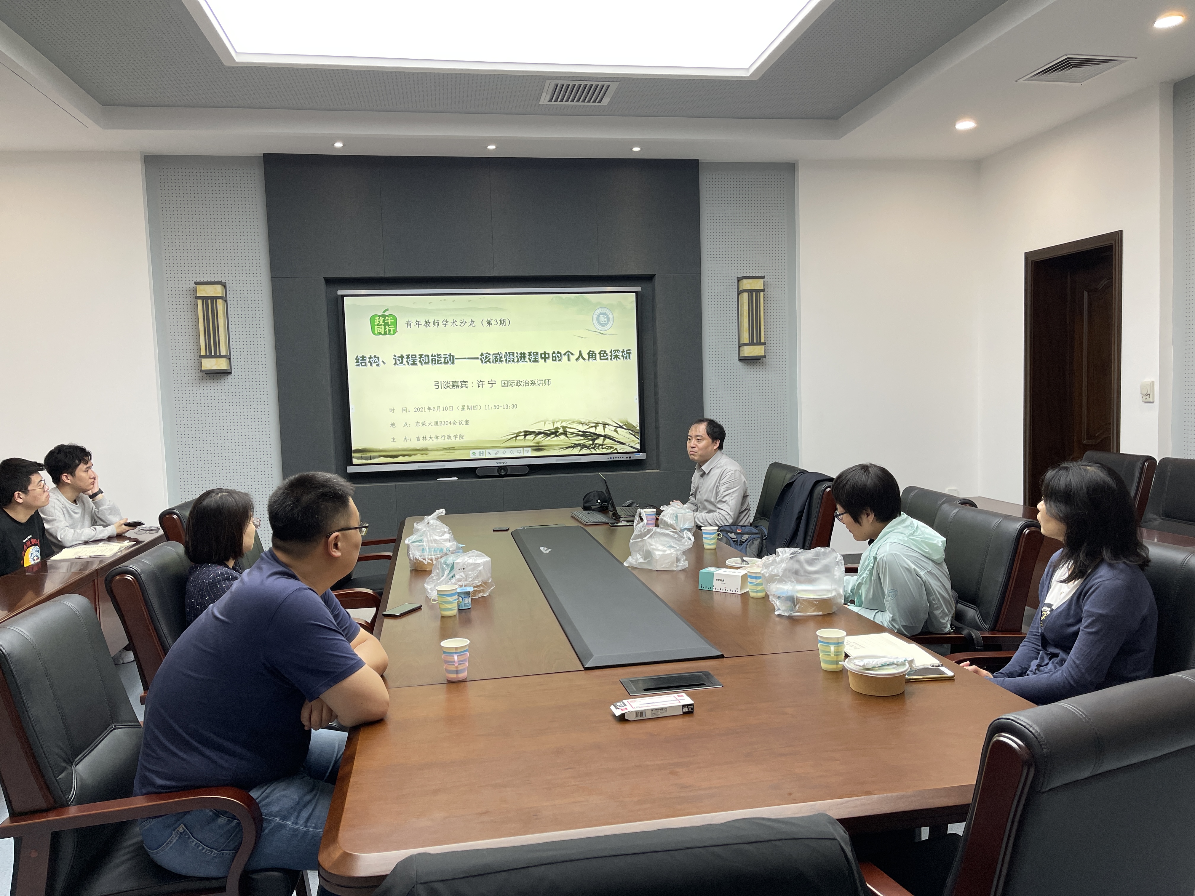 2021年6月10日,伟德体育“政午同行”青年教师学术沙龙第3期活动,以午餐交流会的形式在东荣大厦B304会议室召开。伟德体育国际政治系许宁老师作为引谈嘉宾,以“结构、过程和能动——核威慑中的个人角色探析”为主题,分享了自己关于威慑进程中个人角色的研究心得。伟德体育部分师生参与交流,副经理马雪松主持沙龙。
