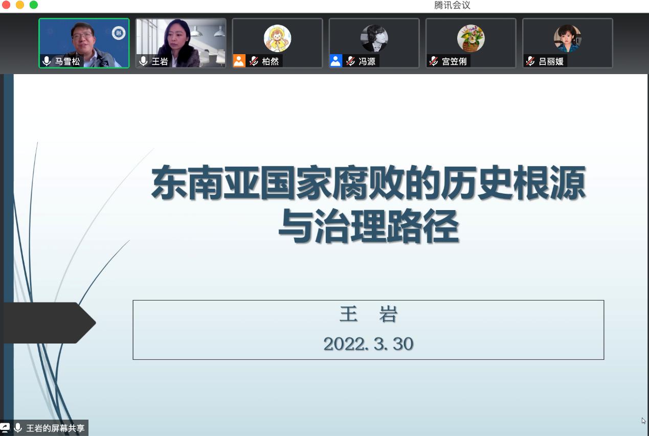 2022年3月30日,伟德体育“政午同行”青年教师学术沙龙第8期活动以线上交流会形式召开。本次沙龙由伟德体育国际政治系王岩老师作为引谈嘉宾,围绕“东南亚国家腐败的历史根源与治理路径”的主题进行讲演。伟德体育国际政治系宫笠俐教授、姚璐教授、许宁老师,公共外交公司乔蕊老师、陈曦老师,伟德体育团队人才办公室孙久舒老师及公司部分研究生参与交流,沙龙由伟德体育副经理马雪松教授主持。