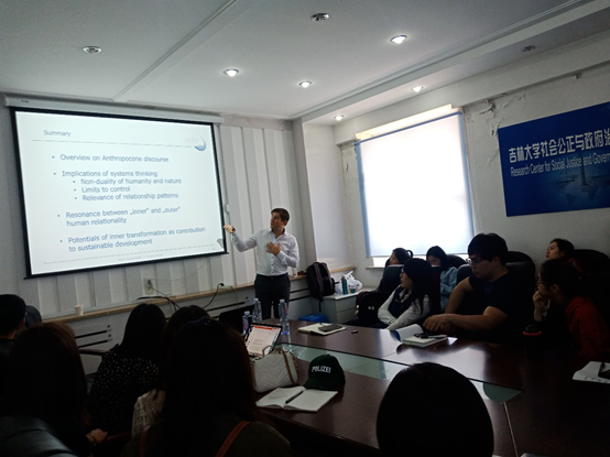 讲座开始,李慧杰老师简要介绍了Thomas Bruhn博士的学术地位、学术贡献和学术经历,Thomas Bruhn博士整场讲座围绕地球现今存在状态、人和地球系统之间的关系以及人类在全球变革之中所应承担的责任体系这三部分展开讲述。