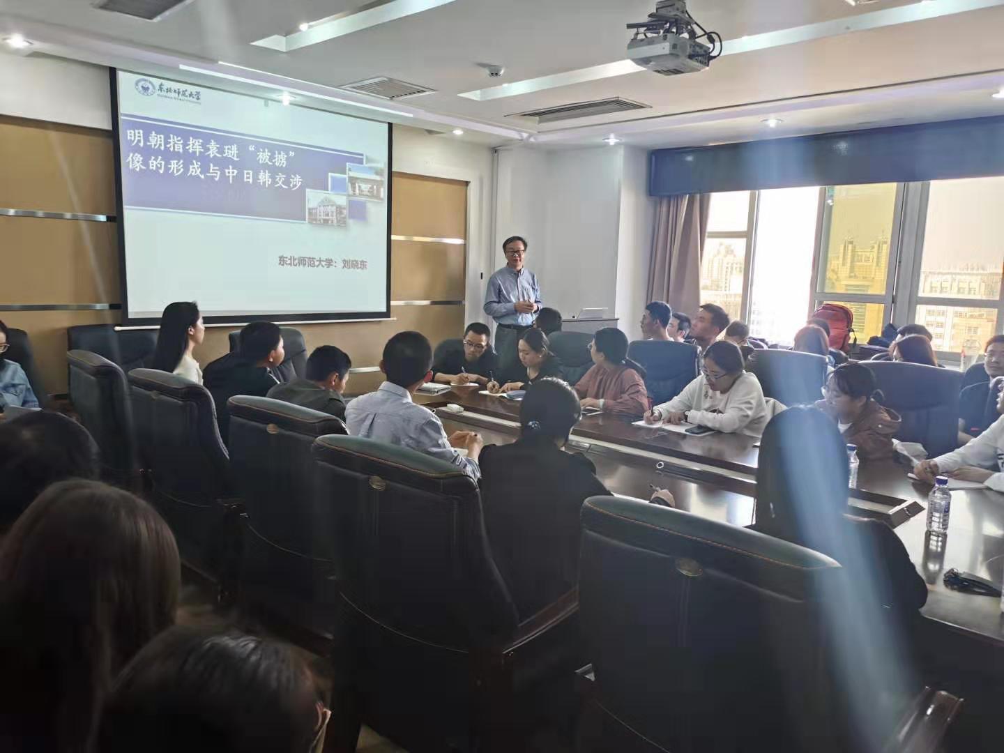 首先,刘晓东教授从选题角度入手,提出选题的脉络为有小渗大,表明历史瞬间的事件亦能够反映出当时东亚区域秩序的样态,并探讨了“宁波争贡事件”作为明·日关系中的转折事件需进一步思考,从多角度分析了其并非根本性转折。除此之外,重点阐述了明朝指挥袁琎被俘事件在东亚诸国交涉中的重要影响及其发展为东亚区域主流性描述的成因,得到了许多员工们的反响与共鸣。随后,师生们对于此次专题展开了激烈的讨论,提出了明朝政府的上贡原则以及学科分解等问题,刘晓东教授都予以了悉心解答,并希望同学们能够见微知著,开拓思维,从历史瞬间中找寻出更多值得探究的内容。