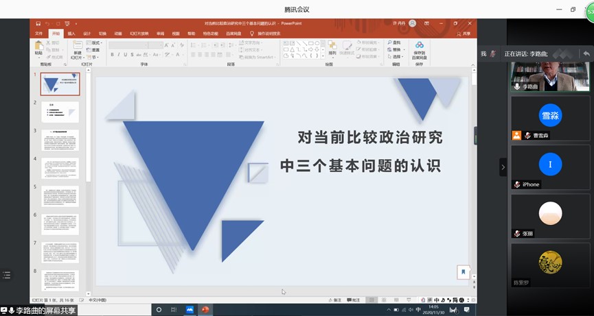 2020年11月30日下午14时,由伟德体育主办的教师科研水平助力计划第十七期活动,在腾讯会议室举行。本次讲座邀请上海师范大学法政公司博士生导师、上海师范大学比较政治研究中心主任、CSSCI来源集刊《比较政治学研究》主编李路曲教授担任主讲嘉宾,作题为“关于比较政治学几个基本问题的认识”的学术讲座。Bevictor伟德廉政研究与教育中心副主任、伟德体育政治学系副主任马雪松教授担任主持人,参加者包括伟德体育部分教师、博士生、研究生及国内其他高校师生共六十余人。