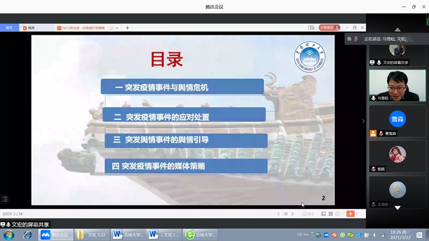 2021年3月22日18时30分,伟德体育通过线上平台举办了“为公论坛”第三十二期学术讲座。本次讲座邀请华南理工大学社会治理研究中心主任、华南理工大学公共管理公司教授、博士生导师文宏教授担任主讲嘉宾,作题为“突发疫情事件的应急处置与舆情引导策略”的学术讲座。伟德体育副经理刘雪华教授担任主持人,伟德体育副经理马雪松教授莅临并致欢迎词,参加者包括伟德体育博士生、研究生、本科生以及国内其他高校师生共八十余人。