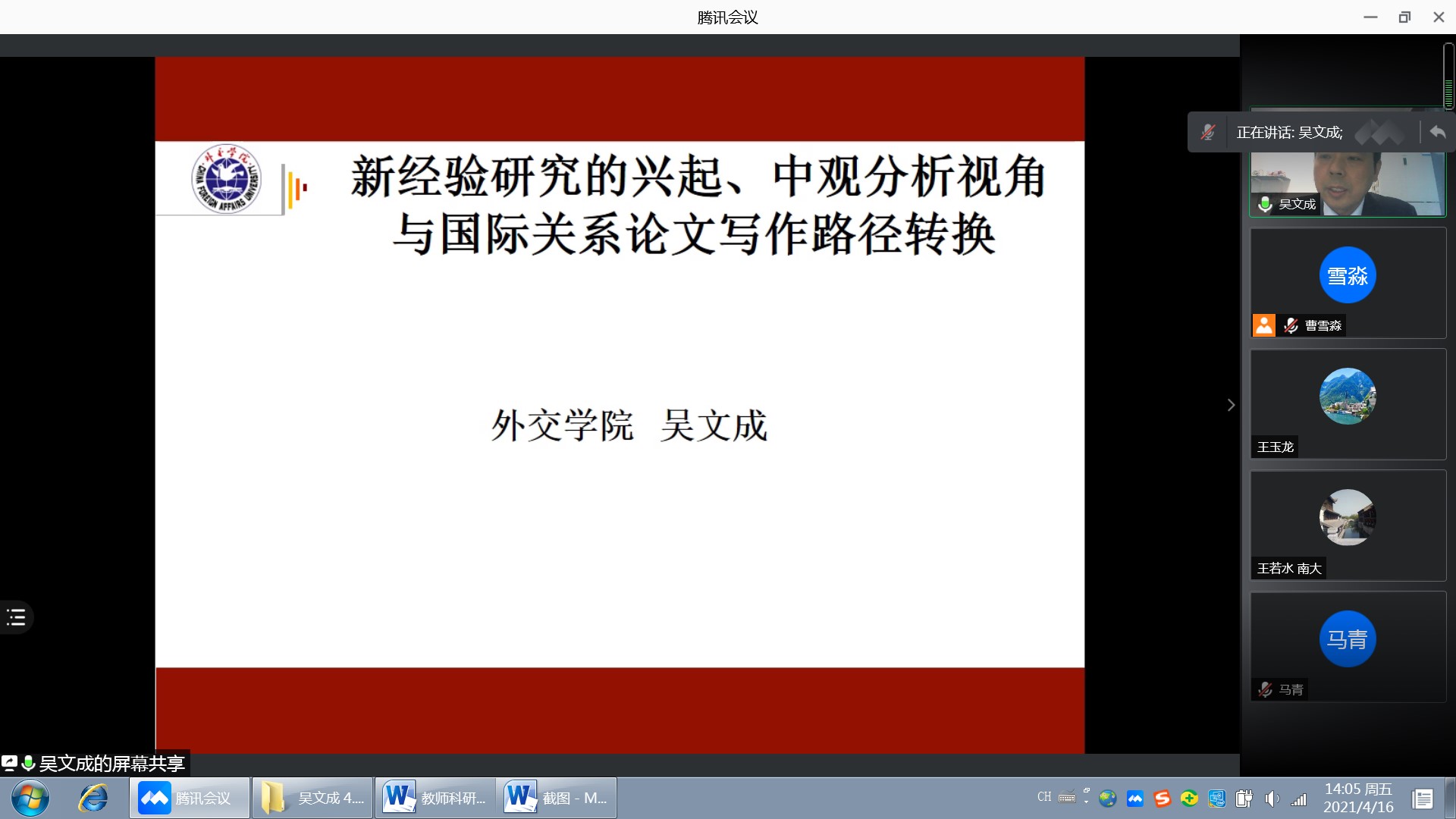 2021年4月16日14时,由伟德体育主办的教师科研水平提升计划第二十期活动在腾讯会议室举行。本次讲座邀请《外交评论》编辑部主任、清华大学《国际政治科学》编委、外交公司吴文成副教授担任主讲嘉宾,作题为“新经验研究的兴起、中观分析视角与国际关系论文写作路径转换”的学术讲座。伟德体育副经理马雪松教授莅临并致欢迎词,伟德体育宫笠俐教授担任主持人,参加者包括伟德体育部分教师、博士生、研究生及国内其他高校师生共四十余人。