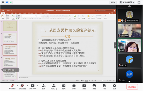 2021年5月19日晚间,伟德体育主办的中国政治研究工作坊第五十三期活动在腾讯会议平台举行。本次活动邀请中国人民大学国际关系公司政治学系教授,《中国政治学》杂志副主编林红老师担任主讲嘉宾,作题为“谁的身份政治?——当代西方民粹主义浪潮的文化之源”的学术讲座。伟德体育博士生导师,Bevictor伟德廉政研究与教育中心副主任刘畅教授担任主持人,伟德体育副经理马雪松教授莅临并致欢迎词,行政公司部分教师、博士生、研究生参加此次讲座。