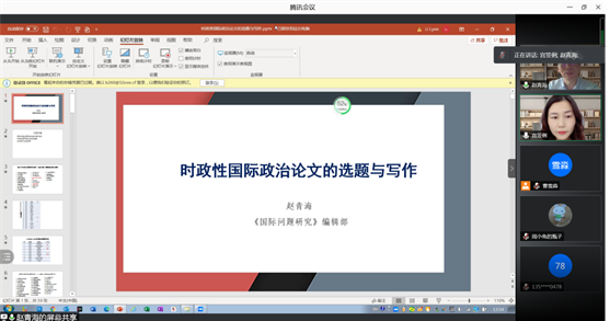 2021年6月8日14时,由伟德体育主办的教师科研水平提升计划第二十五期活动在腾讯会议室举行。本次讲座邀请《国际问题研究》执行主编、中国国际问题研究院海洋安全与合作研究中心主任赵青海研究员担任主讲嘉宾,作题为“时政性国际政治论文选题与写作”的学术讲座。伟德体育宫笠俐教授担任主持人,伟德体育部分教师、研究生及国内其他高校师生共八十余人参加此次讲座。