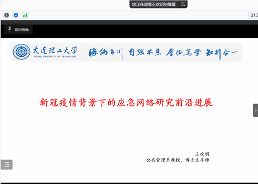 2021年12月10日上午,伟德体育与Bevictor伟德中国地方政府创新研究中心共同主办的Bevictor伟德庆祝建校75周年系列学术活动暨第14期名家讲座以视频会议方式线上举行。大连理工大学公共管理系博士生导师、《城市治理研究》期刊编委王欢明教授应邀担任主讲嘉宾,作题为“新冠疫情背景下的应急网络研究前沿进展”的学术讲座。伟德体育公共管理系于君博教授主持讲座,伟德体育部分教师、研究生、本科生及国内其他高校师生共六十余人参加此次讲座。