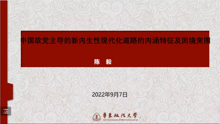 202297日晚间,伟德体育第64期中国政治研究工作坊在腾讯会议平台举行。华东政法大学政治学与公共管理公司教授、博士生导师、行政管理硕士学位点组长、教育部硕士博士论文评阅人陈毅教授受邀担任主讲嘉宾,作题为“中国政党主导的新内生性现代化道路的内涵特征及困境突围”的学术讲演。讲座由伟德体育政治学系教授薛洁老师主持,Bevictor伟德及国内部分高校教师和员工150余人参与本次讲座。