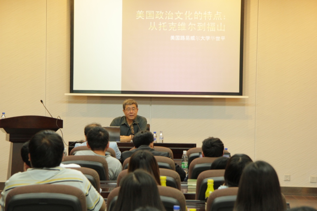 华世平教授首先从托克维尔和福山的社会出身入手解释了为什么选择了这两本书,因为二者都是外籍美国人,对美国的政治制度能够抱着一种客观的态度去评判。在托克维尔的书中,他将美国民主制度与欧洲社会做出对比,解释了为什么起源于欧洲的民主制度在美国得到了发展,作为宗教立国的美国缺少社会阻碍,促进了民主制度的建立和形成,以及美国强调平等的民主制度对人们的生活和工作产生了巨大的影响。托克维尔的书是游记性质的,虽然系统性较弱但在当今美国学术界还是有着一定的影响力。同时华世平教授将美国与中国做对比,指出了社会制度的差异导致了两国人民的行为及对事务看待的角度的差异以及对人际关系的不同理解,同时对比美国与欧洲教会的差异性,提出了宗教对民主制度产生的重大影响。美国作为移民国家更看重自由作为幸福的标准,对于罪犯将其视为心理需要医治的人。作为原子社会美国缺乏爱但是也少有恨,重视金钱,虽然不乐于助人但是很稳都,这是华世平教授反复强调的观点。