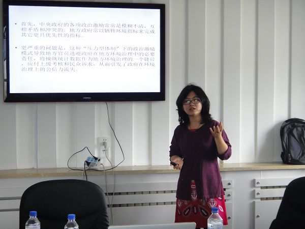 首先,冉冉博士介绍了关于研究中国环境危机的相关文献与她的研究方法。冉冉指出现有的研究倾向于将中国的环境危机归结为地方环境治理的失败,认为地方政府及官员应对其负主要责任。冉冉认为,这种研究思路存在着不足,她认同美国中国问题专家李侃如教授(Kenneth Lieberthal)的观点,即中国的环境问题应该从一个更加宏观的政府治理体系来分析,特别是权威的分配和激励结构。因此,冉冉试图将中央政府的作用重新带回到地方环境治理中,详细考察中央政府的政治激励与地方环境治理的关系。方法论方面,冉冉主要采用的是深度访谈和文献分析的方法。一手资料主要来自于访谈记录、田野研究中搜集的政府内部公文和地方报纸。二手资料来自互联网、报纸、杂志和其它公开的资料。