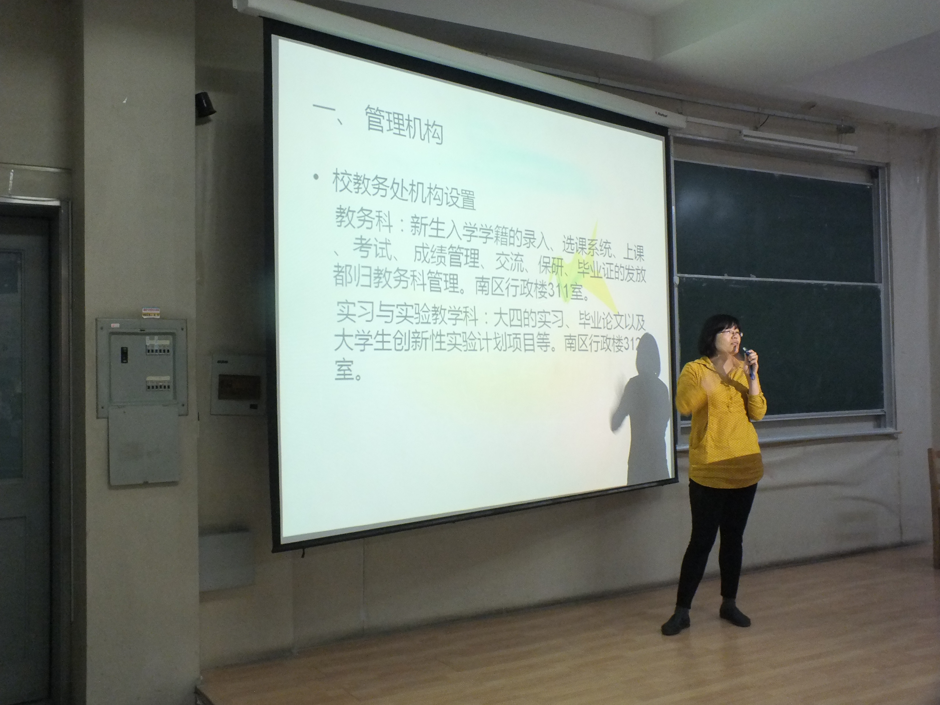 曲文娜老师就公司和公司的本科生教学管理机构设置向大家作了简要介绍,指出新生首先要了解大学的精神,以全面的视角认识大学的理念、功能,作好自我定位,在学习生活中要明确自己的学习目标,既不要盲目乐观也不要随波逐流;新生同学们还要注意转变学习方式方法,增强自主学习能力,适应大学的启发式教育模式。
