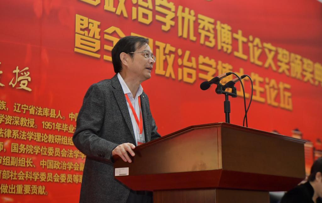 国务院学位委员会政治学学科评议组召集人徐勇教授致辞。他在致辞中充分肯定了设立王惠岩政治学优秀博士论文奖的特殊意义,认为本次奖项设置具有学科“国优”的开创性,以王惠岩先生命名具有极大的象征性和标志性,对于获奖者以及全体政治学人而言是无上的荣光。同时,他从中国政治学的团队建设出发,认为此次博士论文奖的评选体现了政治学人抓住了时代转变的历史机遇期,标志着中国政治学发展由大到优的发展与转变。