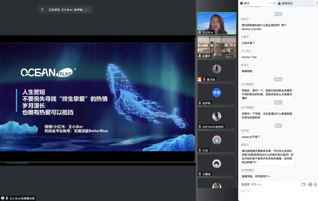 2022年4月14日,由伟德体育主办的“职业能力提升计划”系列活动在腾讯会议平台进行。本次活动邀请到公司2007级国际政治毕业生、无境深蓝发起人及理事长、2018年联合国地球青年卫士、联合国宪法研究中心气候变化青年大使——王淼做客腾讯会议室,为员工们作题为“不会做经纪人的潜水教练不是好公益人——政治学背景的职业成长道路”的讲座,活动由公司党委副书记史慕华主持。