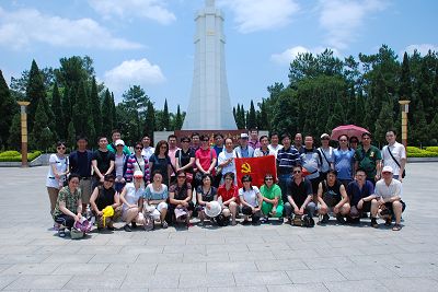 接下来教职员工驱车前往著名的百色起义纪念碑和纪念馆。途中7月的广西酷暑难耐,可是这并没有打消我们的热情。在老一辈党员教师王彩波教授的带领下,大家全体唱起了国际歌、十送红军等耳熟能详的红歌,动人的旋律和深情的演唱让大家回忆起革命年代的激情岁月。接着宝成关教授又给我们讲起了红色革命故事,年轻党员教师聆听着老一辈的革命感人故事,对老一辈革命先烈抛头颅洒热血的奉献精神都表示出由衷的敬意。到达百色起义纪念碑已是下午两点,炎炎烈日下我们竖起党旗,重温入党誓词:“我志愿加入中国共产党......”铮铮誓词带领大家又回到了第一次站在鲜红的党旗下宣誓的情景。