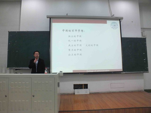 殷冬水副经理从政治学的专业视角深刻解读了“中国梦”的内涵,他指出,中国的百年梦想从历史发展脉络看是“五位一体”的,即“独立梦”、“统一梦”、“民主梦”、“繁荣梦”和“公正梦”,而最终统一为“文明梦”。只有主权国家的建立,共同意识的形成,民主化程度提高,国家富强与繁荣以及社会公平正义才能实现中华民族伟大的中国梦。针对如何建立公正的社会,他分别从当代中国社会不公正的发生逻辑、社会不公正的政治因素以及当代中国社会不公正的治理三个维度进行了专业的分析,使同学们从政治学视角出发更加深入的了解了当今社会的公正问题。在讲述当代社会不公正发生的原因时,他系统分析和归纳了学术界的不同论点,并总结为“自然差异论”、“市场改革论”、“政府政策选择论”、“政府权力失控论”和“全球化论”五个方面,使同学们全面的了解了学术界对社会不公正产生原因的观点和看法;他还基于政治学的研究视角认为“利益表达失衡”是当代中国社会不公正产生的政治因素,并从中国弱势群体的“失声”以及强势群体的“控制”两个方面进行了具体阐述,着力强调“利益表达失衡产生、加剧和固化了当代中国的社会不公正”这一论断;他最后对当代中国社会不公正现象的治理提出了几点建议,他认为提高国家的自主性与提高政府觉得的民主化水平是解决社会不公正现象的重要途径。讲座后,他还针对同学们的疑问和困惑进行了耐心的回答与解释,同学们深为他诙谐幽默的语言、平易近人的态度、睿智缜密的思维以及深厚扎实的理论功底所钦佩。