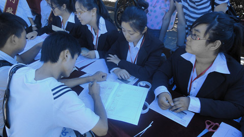 公司迎新点设在五月花广场。在这里,各公司搭起帐篷,竖起标牌,等待新生的到来。公司工作人员身着正装,显得严肃认真且精神抖擞。他们将引导新生填写各类信息,并为陪同家长提供细致入微的服务。细心观察,我们可以看到,一些新生因为紧张或是兴奋,而在填写信息的时候遇到各种阻碍,但热心负责的师姐们会第一时间帮助他们解决问题,她们温馨的笑容也舒缓了新生扣紧的心弦。迎新点的工作量是巨大的,在一天的忙碌后,工作人员的脸上往往会流露出一丝倦意。