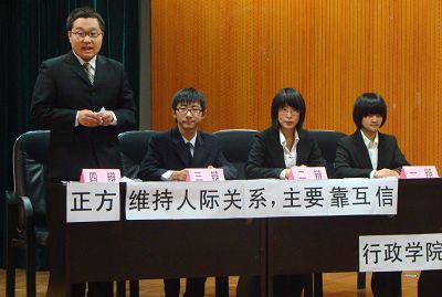 开篇立论阶段,我方通过互信与互利的对比说明了互信在维持人际关系过程中占主导地位,反方则从物质和精神两个层面阐述了互利的重要性;在激烈的攻辩与自由辩阶段,双方唇枪舌战,现场气氛达到高潮。我方在思维、表达、配合等方面略胜一筹,赢得了全场的掌声。首战告捷,我方三辩吴兴识同学以其出色的表现成为本场最佳辩手。
