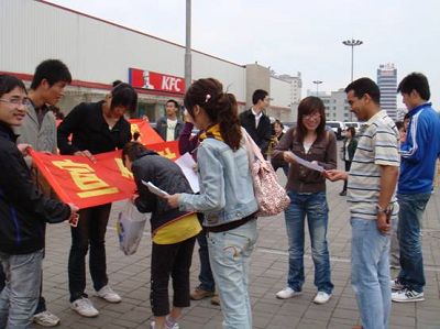 07级三班团支部的成员怀着无比激动的心情,带着当代老员工对祖国固有的情感,充满着对本次实践活动的好奇心,在当天的下午14时来到了沃尔玛门口。在本次活动中,支部成员分为了三组,分别负责持条幅、引导和采访。同学们面带笑容手持条幅,积极上前引导市民在条幅上签名,以专业视角来采访现场群众,每位同学都在自己负责的岗位上尽职尽责。