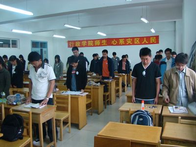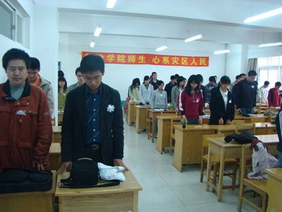 伟德体育本科生在学办老师的组织下进行集体默哀,下午2点10分,马景惠老师到第三教学楼513教室,同05级本科员工进行了集体默哀仪式。28分时,警报拉响,教室内全体师生身带白花,起立默哀,沉痛悼念灾难中逝去的同胞兄弟们,整个教学楼陷入了庄严的沉寂中。