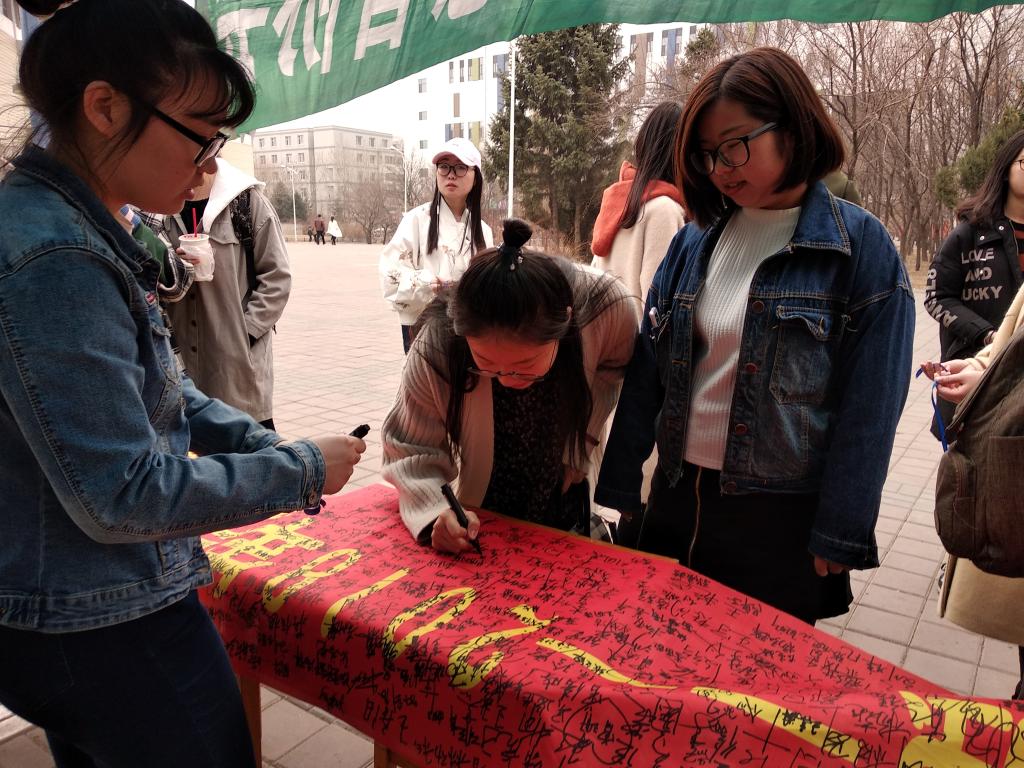 活动当日,现场志愿者们引导路过师生在宣传横幅上签名并系上蓝丝带。同时,帮助路过师生更多了解自闭症,并倡导大家多多参与关注自闭症儿童的相关活动。