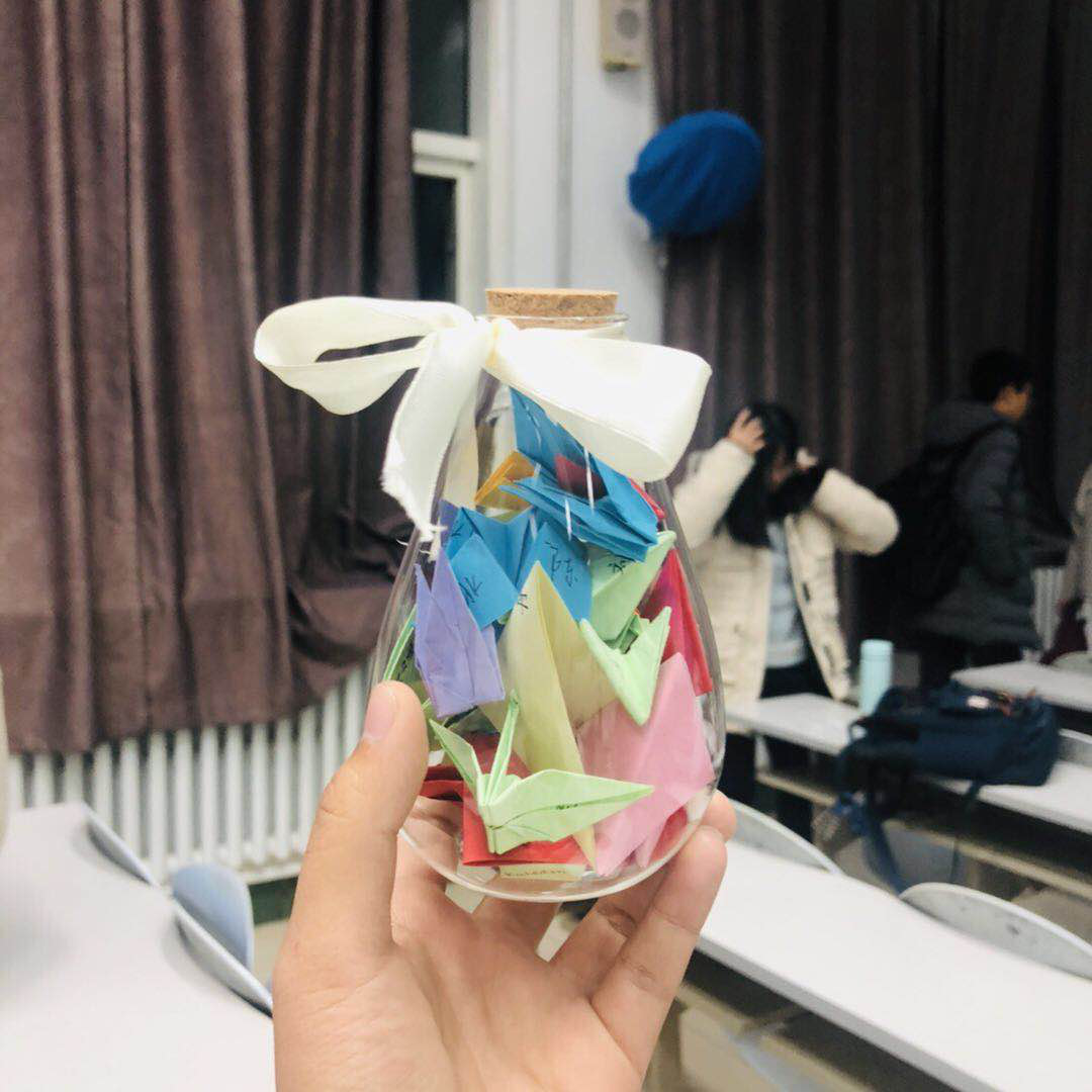 活动伊始,王馨瑶同学就组织同学们在许愿纸上书写自己关于青春的愿望、大学四年的计划和对自己的要求,并分享了自己对于青春的感悟。在对青春许愿的过程中,6位同学用PPT展示了有关“奋斗”、“奉献”的人物事迹。其中,张译文同学以军校员工为例讲述军人对国家的奉献,并向人民英雄致敬,引发了大家对“奉献”的思考;武俊豪同学讲述了雷海为从外卖小哥到诗词大会总冠军的逆袭,并认为坚持自己喜欢的事情也是一种奋斗。活动最后,大家一起把许愿纸放在了1班的时光瓶里,希望四年后打开时每个人都能够实现自己的目标。