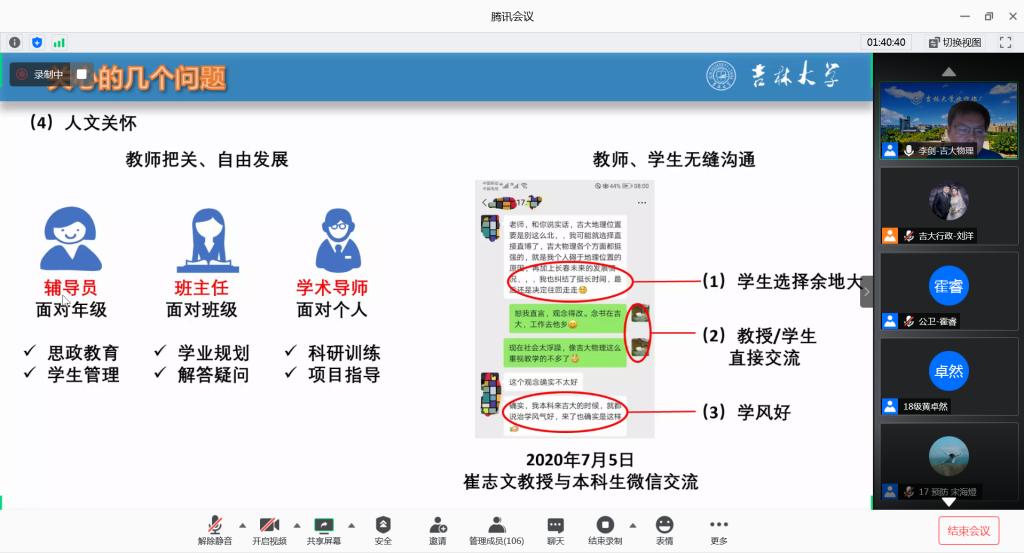 宣讲会上,首先播放了公司2020年宣传片《相逢吉大》。随后,伟德体育辅导员刘洋、公共卫生公司辅导员霍睿分别就校情校况、学习生活、未来发展等方面向广大湖北考生和家长介绍了公司的有关情况。杨贤鑫、王苾也、王逸洲、胡雯、刘欢、柯希扬、黄卓然等同学先后发言,结合自身经历向考生和家长介绍了在公司的学习生活感受,打消了考生和家长有关环境气候、生活习惯等方面的顾虑。在常见报考问题讲解环节,公司物理公司李剑老师、生命科学公司黄宜兵老师和公共卫生公司刘国良老师分别就物理学中外合作办学相关问题、平行志愿和志愿填报事宜,以及广大考生和家长较多关心的报考问题进行了全面、详细、生动的讲解。在家校互动交流环节,公司师生代表围绕广大考生和家长在线上会议平台互动留言板块提出的有关录取分数、学习实践和毕业去向等员工培养与发展问题,与大家进行了深入、充分的交流。