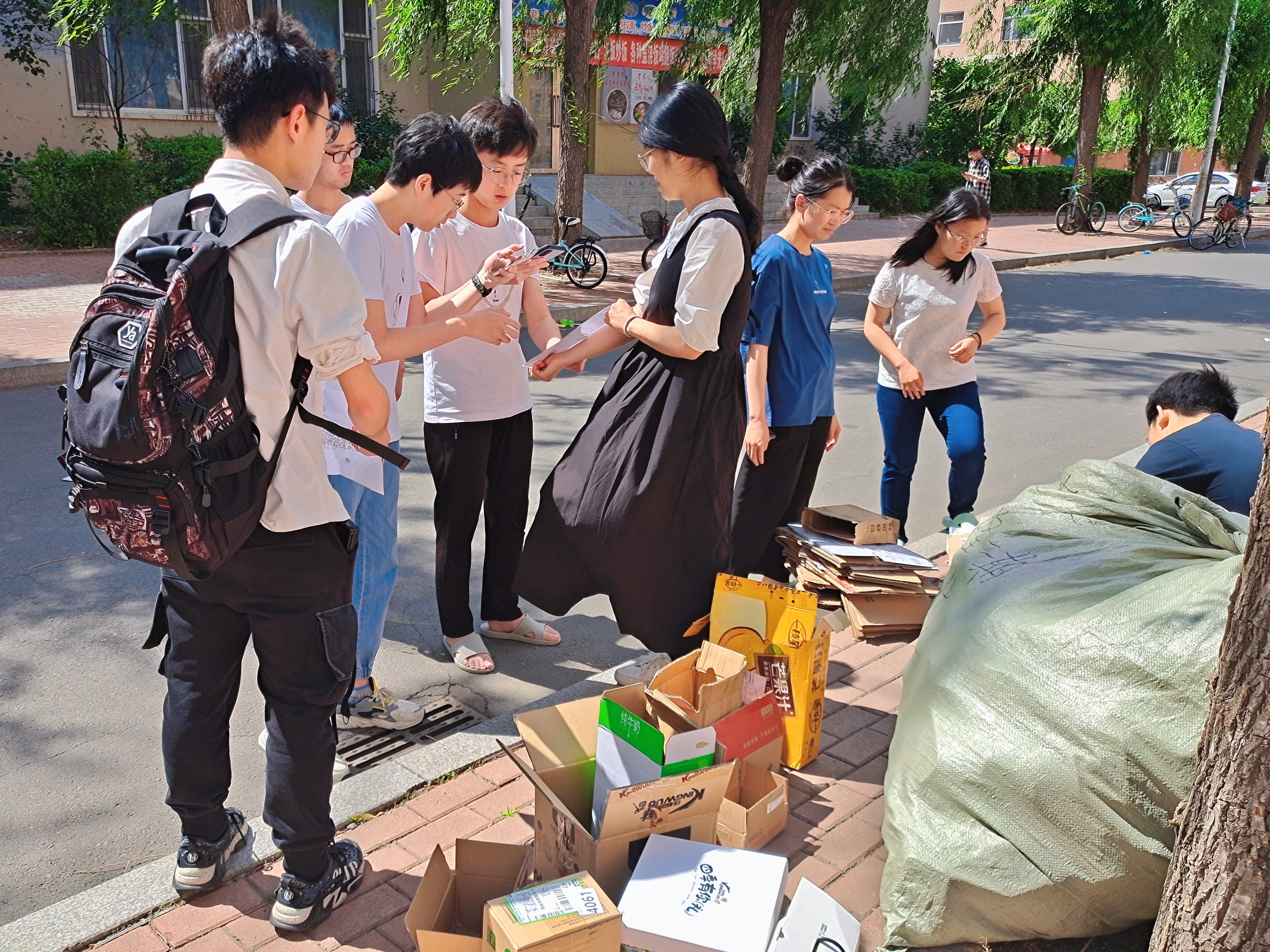 上午10时,活动正式开始。活动志愿者们开始轮岗值守,为前来捐赠纸箱的同学们登记信息,进行纸箱数量的清算和拆分折叠等工作。17时,回收活动正式结束。执行团成员刘子杰带领志愿者们对收集到的纸箱进行了整理、打包。此次活动参与人数超过九十人,共收集到纸箱二百余斤,全部捐赠给了大学城乐收快递站进行回收利用。