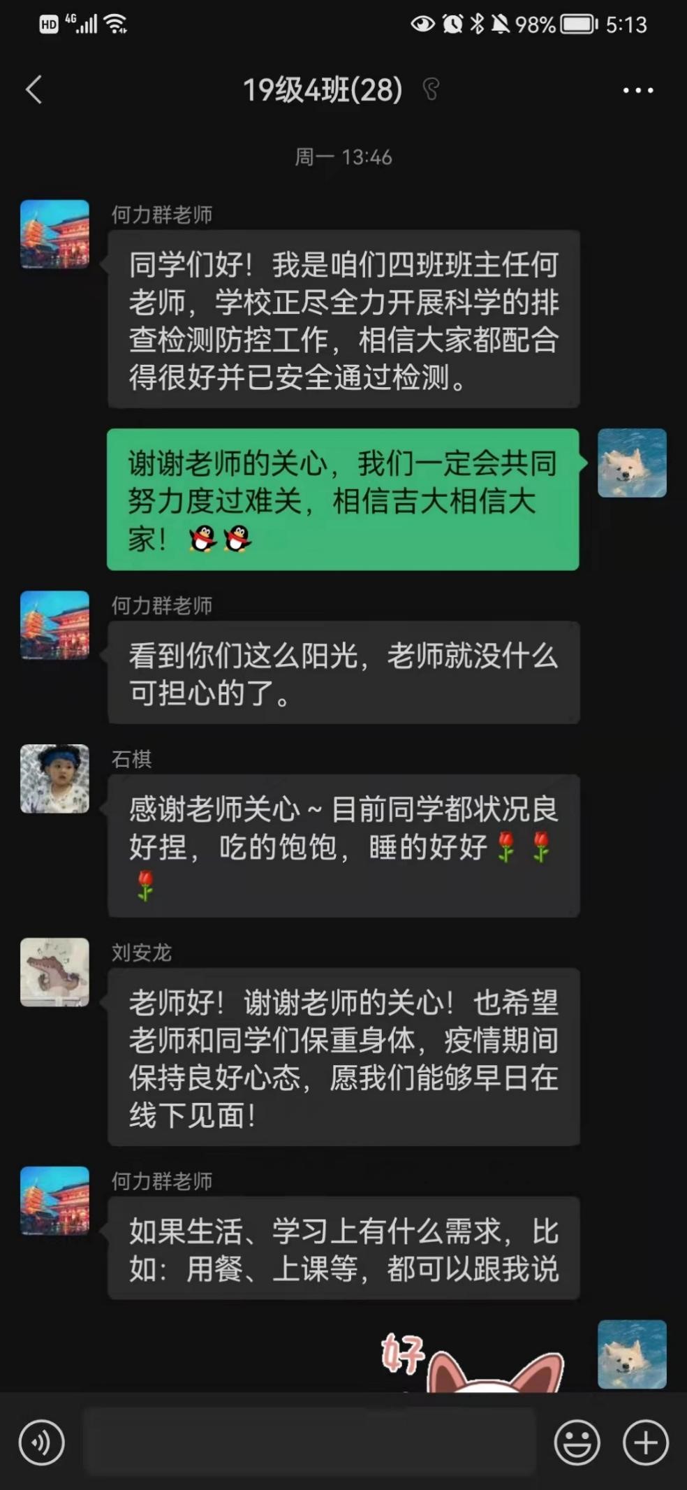 14日下午,在2019级四班班会上,班主任何力群老师首先了解了同学们在用餐和学习方面的情况,并表示如遇问题要及时向老师和公司反映;接下来,老师在班级微信群内就学习、生活、心理状况等方面与同学们进行了深入的沟通,并表达了对大家的深切关心与期望;同学们在微信群里积极回应老师,班会气氛活跃。