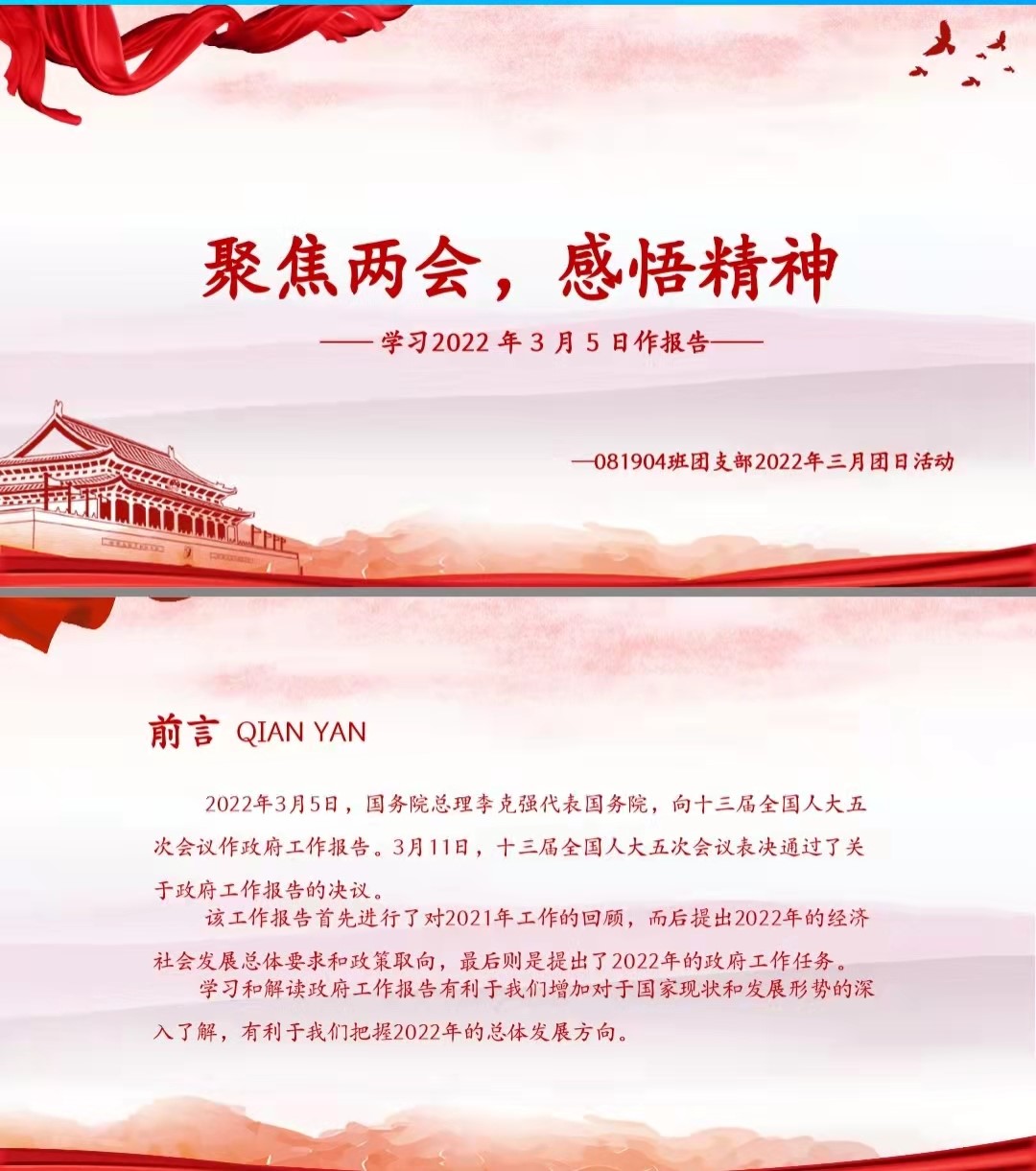 2022年3月5日至11日,全国两会在人民大会堂顺利召开。国务院总理李克强向大会作政府工作报告,回顾了2021年所取得的工作成就,提出了2022年政府工作任务、经济社会发展总体要求和政策取向。为推动两会精神在伟德体育落深落实,鼓励青年同志不忘初心、砥砺前行,在院团委的指导下,伟德体育2019级各班团支部开展了主题为“感悟时代,砥砺奋进,聚焦2022年全国两会”的团日活动。