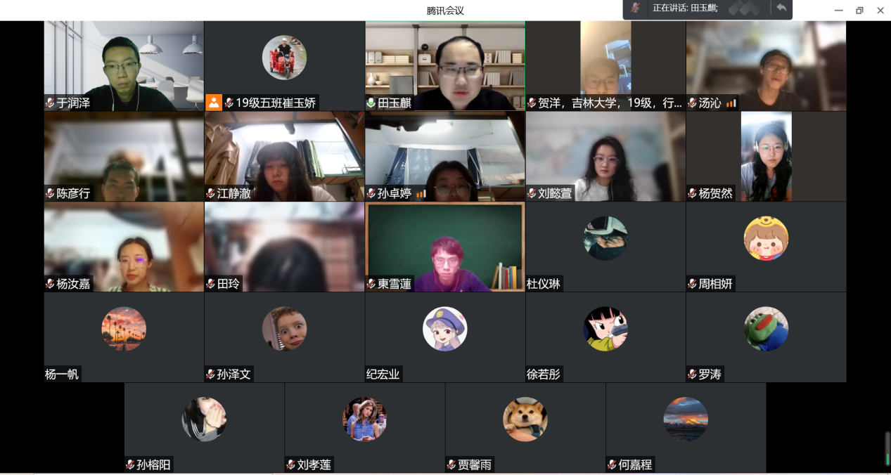24日晚,在2019级五班班会上,班级全体同学和班主任田玉麒老师针对当前疫情严峻形势共同分享封闭期间生活的感受。在班会中,田老师首先向同学们介绍了公司公司最新的防疫政策和相关措施,距离上次班会已经过去一周时间,同学们的心态也发生了一定的变化,田老师关心了同学们寝室生活的基本情况,为同学们进行了心理疏导,并向同学们介绍了公司举办的学术征文比赛并鼓励同学们积极参加。随后,田老师与贺洋、刘懿萱、罗涛等十名同学互动,询问同学们现阶段的学习状况与学业规划,为一些存在困惑的同学提供建议,传授查找文献的经验。最后,田老师勉励同学们保持定力,维持良好的身体、心理和学习状态。