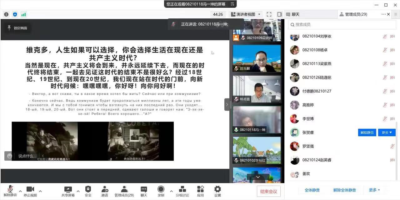 在2021级一班的班会上,刘享依、万子君、赵莞昕同学通过分享近期观看的电影、书籍和短片,用文字引发同学共鸣,给予满满温暖;冯一坤同学用流利俄语介绍《歌唱动荡的青春》,鼓舞人心且回味无穷;扎西拉姆同学介绍自己家乡西藏,让大家享受了一次云游雪山的奇迹体验。班主任林奇富、田玉麟老师首先对四位同学的分享进行点评,为同学们积极准备、传递知识的行为表示肯定,并号召同学们在大学期间开拓自身视野、增长见识、提高本领,学习新技能,以更好地适应未来就业竞争新形势,做到课堂理论与社会实践结合。同时两位老师鼓励同学服从公司与公司安排,克服封寝困难,保持信心,坚定信念,共盼花开。