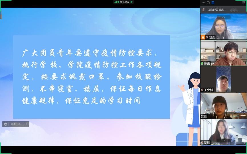 本次团日活动以腾讯会议的形式开展,整体分为学习解读、分享感悟、总结收获三个环节。活动伊始,各班团支书带领大家认真学习了本月理论材料,并结合教育部近期颁布的教学文件与自身经历进行讲解,使同学们更好地了解到党中央对防控疫情的坚定信心,对民生的真实关切,对部署工作的严谨思虑,同时还加深了同学们对现有校园疫情防控政策的理解。随后,同学们结合身边的抗疫事迹积极分享自己的感悟,梁恩昊(2019级本科生)从自身预备党员的身份着手,分享了自己担任宿舍楼志愿者的心得感悟,表示自己的党性修养在疫情防控的志愿服务实践中得到了锻炼提高;周密(2019级本科生)从疫情期间老员工心理健康问题出发,鼓励同学们正确处理焦虑、抑郁情绪,通过学习,运动,心理咨询等方式调节自身心理状况,以积极心态迎接困难;贺洋(2019级本科生)分享了封寝期间教师和其他公司工作人员以及志愿者所展开的具体工作,鼓励大家坚持防疫、做好相关的自我防护。最后,各班团支书归纳总结了同学们的发言,号召全体团员坚定抗疫必胜的信心,践行“同心战‘疫’,请党放心”的青春誓言。