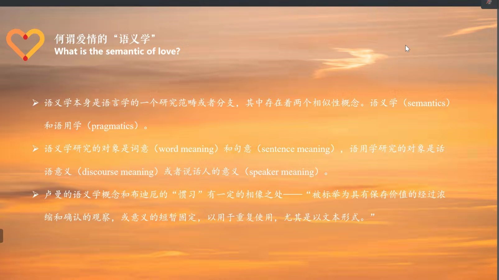 此次是《作为激情的爱情》读书会第三周。领读教师张力伟老师以“爱情的‘语义学’:兼谈知识社会学的一些问题”为主题,介绍了尼克拉斯·卢曼在《作为激情的爱情》一书中的爱情语义学问题,并拓展讲述了知识社会学的基本内容和重要意义。张力伟老师指出,语义学本身是语言学的一个研究范畴或者分支,其中存在着两个相似性概念:语义学和语用学,卢曼的语义学概念和布迪厄的“惯习”有一定的相像之处。此外,张老师还讲述了知识社会学方法与特点,基于此,带领员工们深入理解了政治学研究中的若干方法论问题。