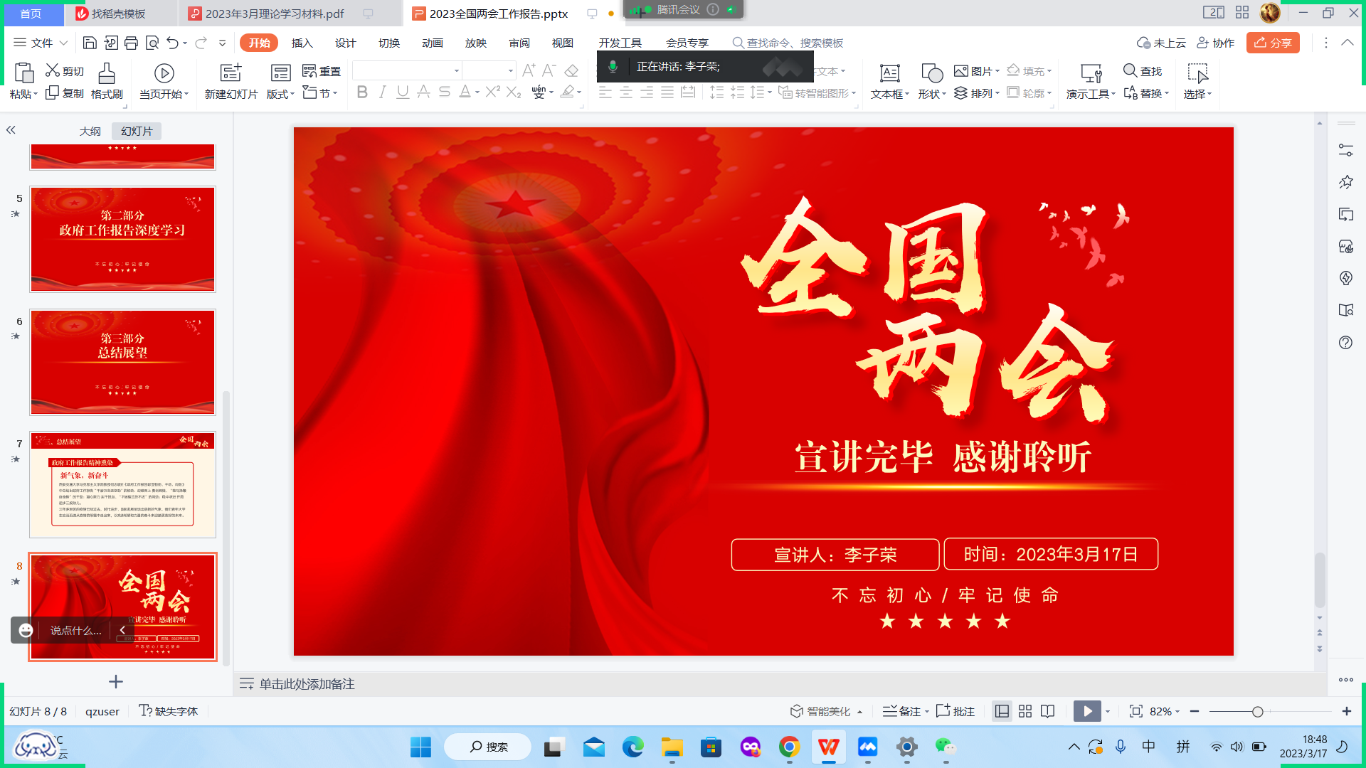 总之,同学们在本次团课过程中认真学习和领会到了两会精神,感受到了强国建设民族复兴的磅礴力量。也更加明晰了大家怀抱梦想又脚踏实地的实践方向,更加坚定了敢想敢为又善作善成的提升方向。开局知奋进,路虽远,行则将至;事虽难,做则必成。在2023年全国两会精神的倡导和党的伟大领导下,我们必会坚持以中国式现代化全面推进中华民族伟大复兴,朝着全面建成社会主义现代化强国的宏伟目标奋勇前进!(图文:2020级团支书及宣传委员 责编:公司员工会新闻宣传部)