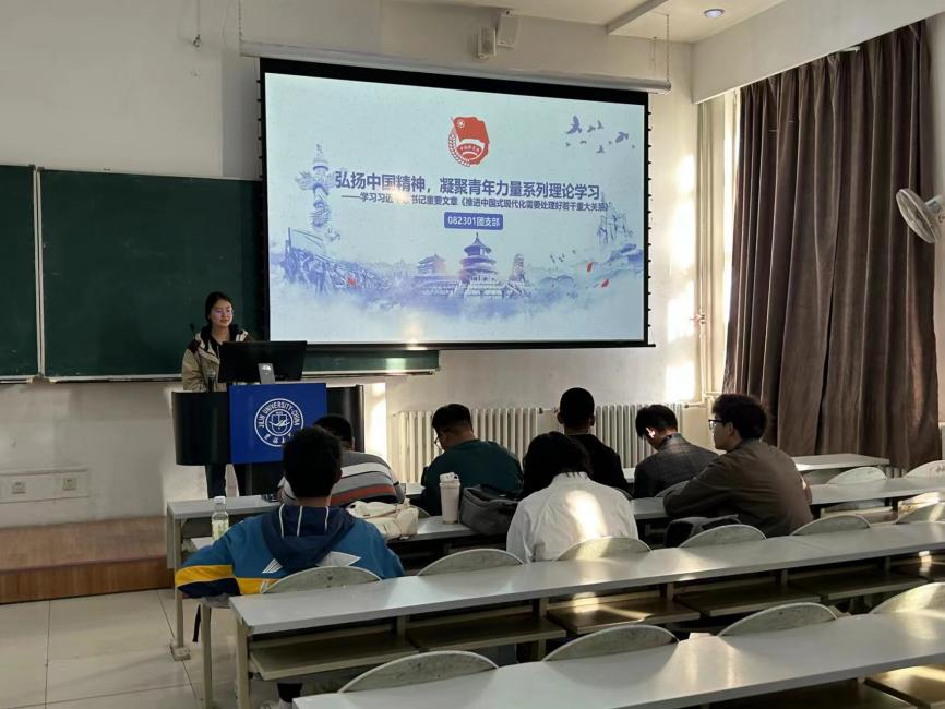 第三环节,分享交流。苍一宁(2023级本科生)联系现实,从日常生活助推现代化的角度入手,提出了青年一代推动实现中国式现代化的现实途径。刘玉馨(2023级本科生)、张雪伦(2023级本科生)围绕此次会议内容积极发言,并指出同学们要敏锐洞悉前进道路上可能出现的机遇和挑战,以科学的战略预见未来、引领未来,为建设富强民主文明和谐美丽的社会主义现代化强国而奋斗。最后,各班团支书总结同学们的发言,号召大家始终做到实心干事业、尽责担当,始终做到热心为青年、朝气蓬勃,始终做到虚心求革新、清澈纯粹,切实当好新时代党的忠实助手和可靠后备军。