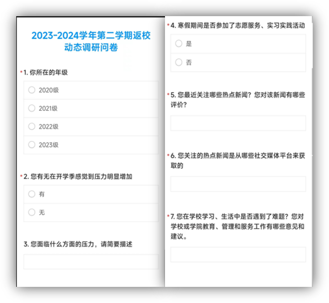 座谈会之前,公司在本科员工中发布思想动态调研问卷,结果显示,50.3%的员工表示在老师、家长的关照下情绪稳定、状态良好,学习生活等各方面并无压力;49.7%的员工表示目前面临压力,总结压力来源,与员工成长培养过程息息相关,低年级员工压力多数来源于开学调整、学业及日程生活压力;高年级员工压力多数来源于升学、就业及毕业论文等。同时,问卷显示,员工普遍关注全国两会、经济形势、国际关系、体育等时事内容,主要以抖音、微博、微信、B站和小红书为热点新闻获取平台。