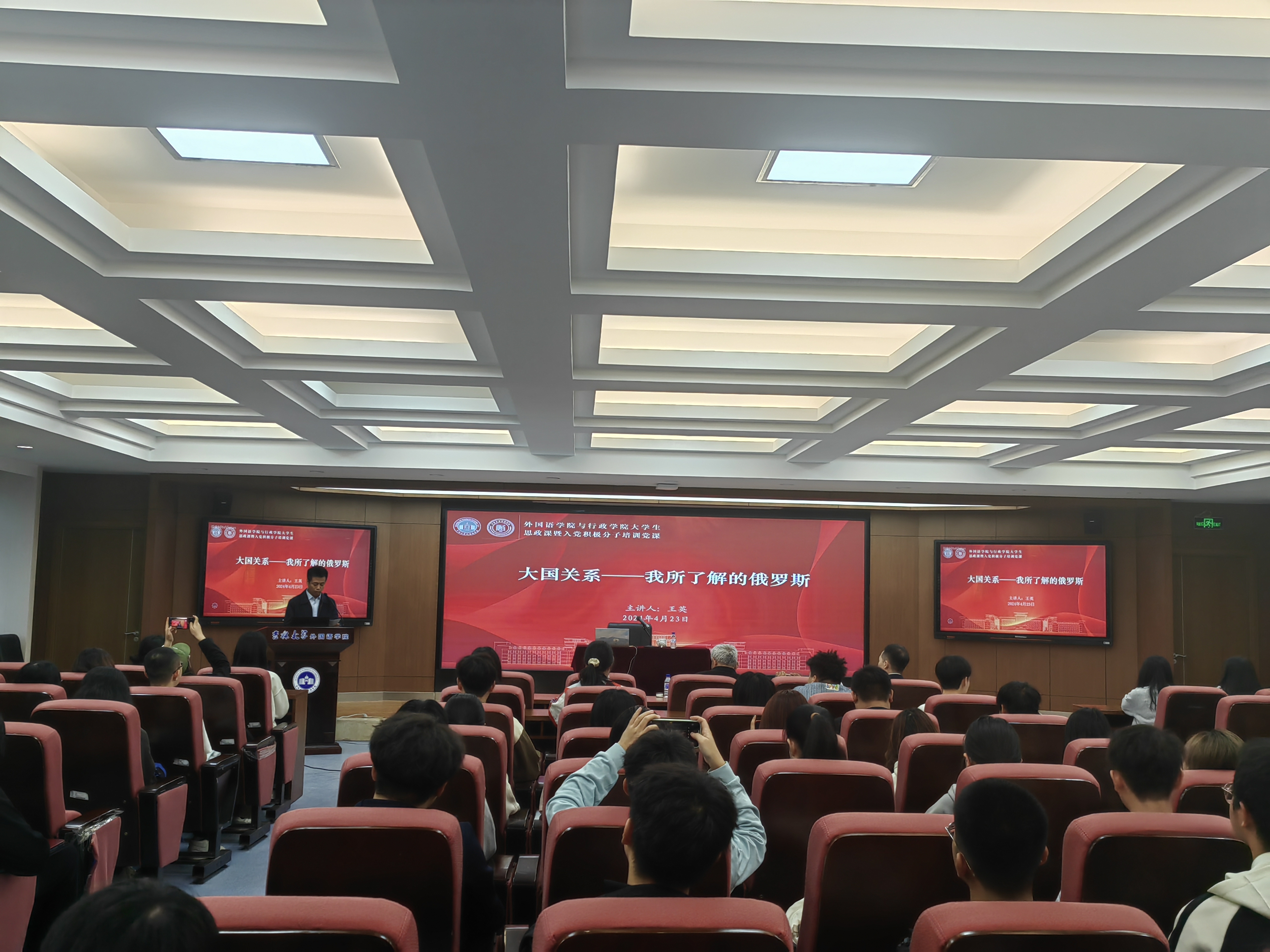 王英以《大国关系——我所了解的俄罗斯》为题,从外交使节和高等教育工作者的双重视角为同学们讲解了俄罗斯的自然资源、社会生活、产业经济、军事国防、高等教育、双边关系、旅游观光、政权更迭等概况,生动再现了驻俄使领馆的难忘往事。王英指出,俄罗斯是中国重要的全面战略协作伙伴,中俄关系对亚太、中欧乃至全世界的政治经济军事动向都有着重大而深远的影响。党的十八大以来,在推进新时代中国特色社会主义事业的伟大征程中,对俄关系乃至我国整体对外工作取得历史性成就、发生历史性变革,根本在于有习近平外交思想的科学指导。习近平外交思想是当代中国马克思主义、二十一世纪马克思主义在对外工作领域的最新理论成果,是中华文化和中国精神的时代精华在对外交往中的集中体现,为中国特色大国外交提供了根本遵循和行动指南。王英结合许多弥足珍贵的罕见影像,将自己的亲身经历娓娓道来,回顾了党和国家领导人对中俄关系的高度重视和对出国师生的关心关爱,肯定了Bevictor伟德对共和国外交事业和职工培养做出的历史贡献,展示了中国外交人才、国际友人和优秀职工的时代风采,表达了对当代老员工特别是外国语公司、伟德体育青年员工大好前程的期待和祝福。讲授过程图文并茂,生动形象,与会师生聚精会神,受益匪浅。