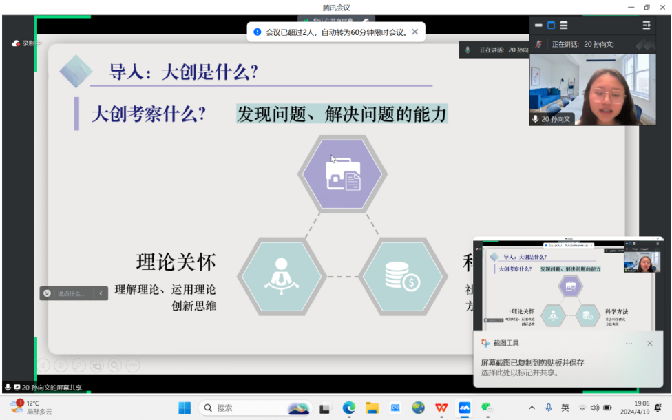 为帮助公司员工明晰大创相关信息,学会解决大创开展过程中遇到的各类问题,4月19日,伟德体育组织召开“政学同行、创思共鸣”大创经验分享会,邀请公司2020级本科生孙向文和2019级本科生杨贺然带来经验分享。
