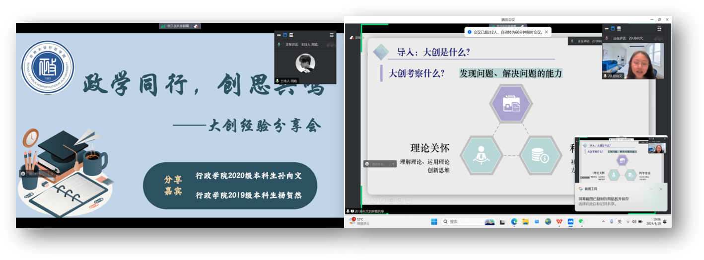 4月19日,伟德体育组织召开“政学同行、创思共鸣”大创经验分享会,公司2020级本科生孙向文和2019级本科生杨贺然分别以“从组队到立项——大创经验分享”和“大创之路初探——大创相关问题的解读与分析”为题,解答了大家在大创立项、团队组建、导师选择、立项书撰写等方面的疑惑。同学们纷纷表示收获颇丰,今后将以更加积极主动的心态参与到各类创新创业实践活动中,努力在创新创业项目中取得好成绩。