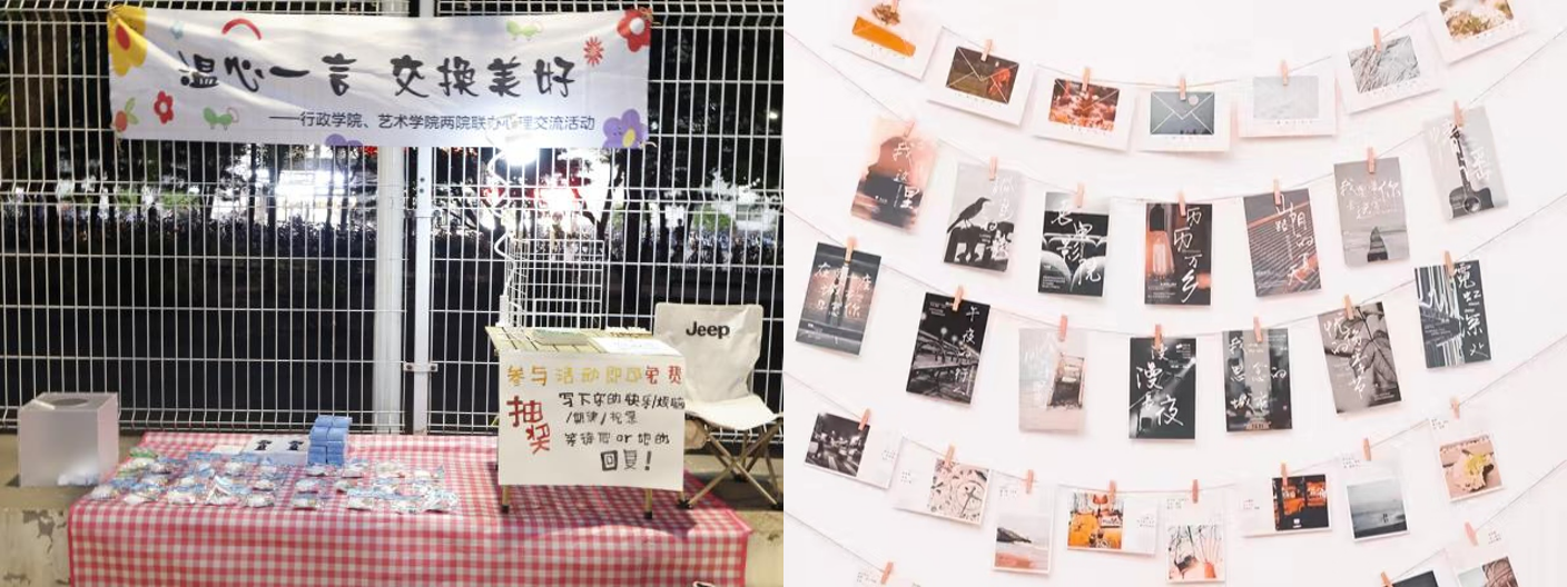 “要切实提高思想认识,以对国家和民族未来高度负责的使命感,以时时放心不下的责任感,紧密结合当前员工心理健康现状和发展趋势,全面加强和改进新时代员工心理健康工作,培育理性平和的健康心态,加强人文关怀和心理疏导”——5月17日、18日,伟德体育、艺术公司联合举办“温心一言,交换美好”心理交流活动。此次“温心一言、交换美好”活动,通过在南区操场设置“心情交流墙”、悬挂“心灵明信片”的方式,为同学们提供了一个分享心情、交流情感的心理平台,引导同学们感受生活的温暖和美好。在活动过程中,同学们纷纷敞开心扉,书写悬挂自己的“心灵明信片”,分享生活、倾诉烦恼焦虑、祝福路人、展望未来,留言互动间展现出彼此间友好的善意与关怀。辅导员经常性深入员工公寓、教室、体育场馆和餐厅,保持与员工群体的密切联系,在建立友好互信的基础上,定期摸排了解员工思想动态、评估员工心理健康状况,结合院级心理辅导室随时开展谈心谈话、开展心理科普,帮助同学们加强情绪管理、排解焦躁忧虑,共同营造安心、舒心、开心的学习生活氛围。