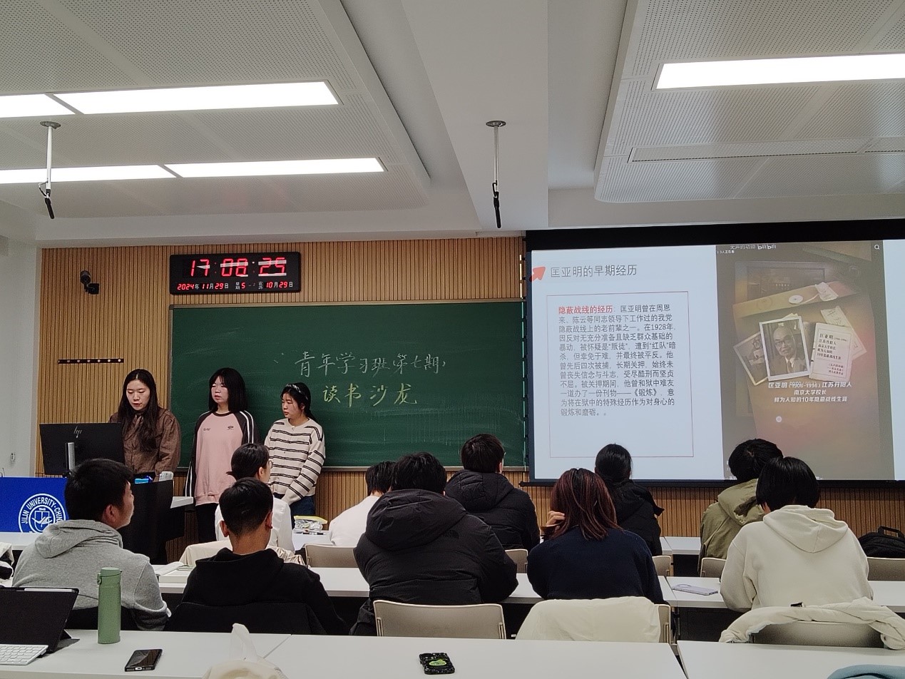 裴嘉琳(2023级本科生)为领学人,带领大家初探“北上精神”。裴嘉琳对作者鲍盛华及本书的创作背景、内容梗概进行详细介绍,让学习班成员走入历史,深刻体会先生们的担当和风骨。