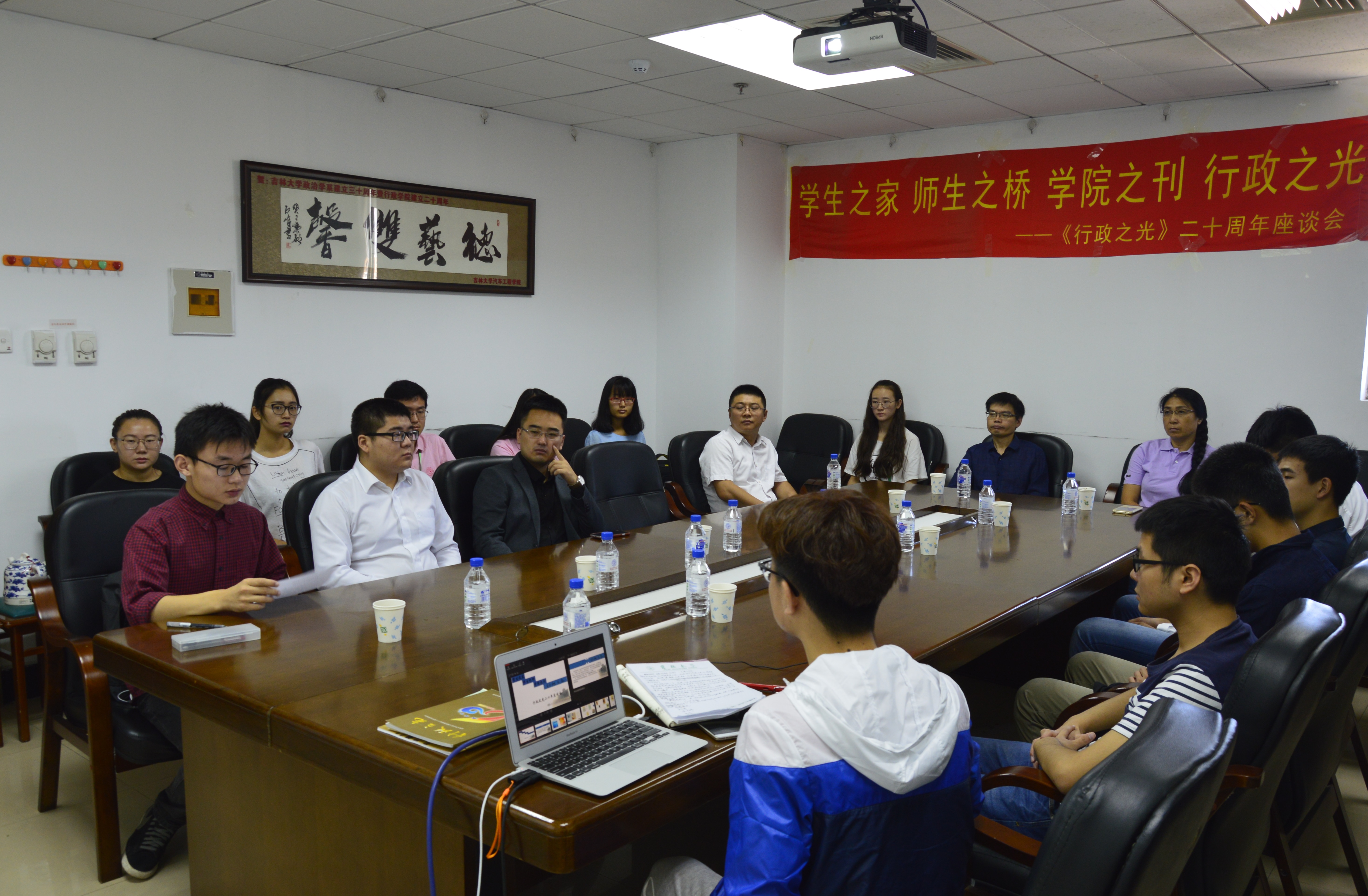 座谈会中,首先由主持人王阳愉介绍到场嘉宾,随后杂志社现任社长求是对杂志社近年来的新发展进行了简单的介绍,并展示了自1996年创刊至今的杂志照片和杂志社宣传片。接下来颜德如老师和张丹竹老师共同讲述了创刊初期的故事。在他们的回忆中,有创刊的初衷,有取名的趣事,有公司的支持,更有王惠岩老先生题写杂志名称时的细致与不苟。陈松、刘洋和张力伟也讲述了杂志社发展过程中的故事。因公未能到场的院友吴滨在微信上表达了对杂志社的怀念和美好祝福。在接下来的畅谈中,颜德如教授在如何办刊、如何提高杂志社影响力等方面提出了建议,他指出要结合互联网平台来发展刊物,要通过邀请名家大家开讲座的方式提高杂志社影响力,将《行政之光》推广到公司甚至是其他高校。最后,工作人员向到场嘉宾发放《行政之光》纪念品并合影留念。
