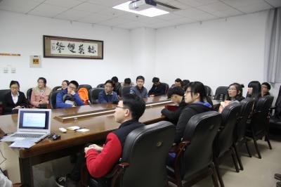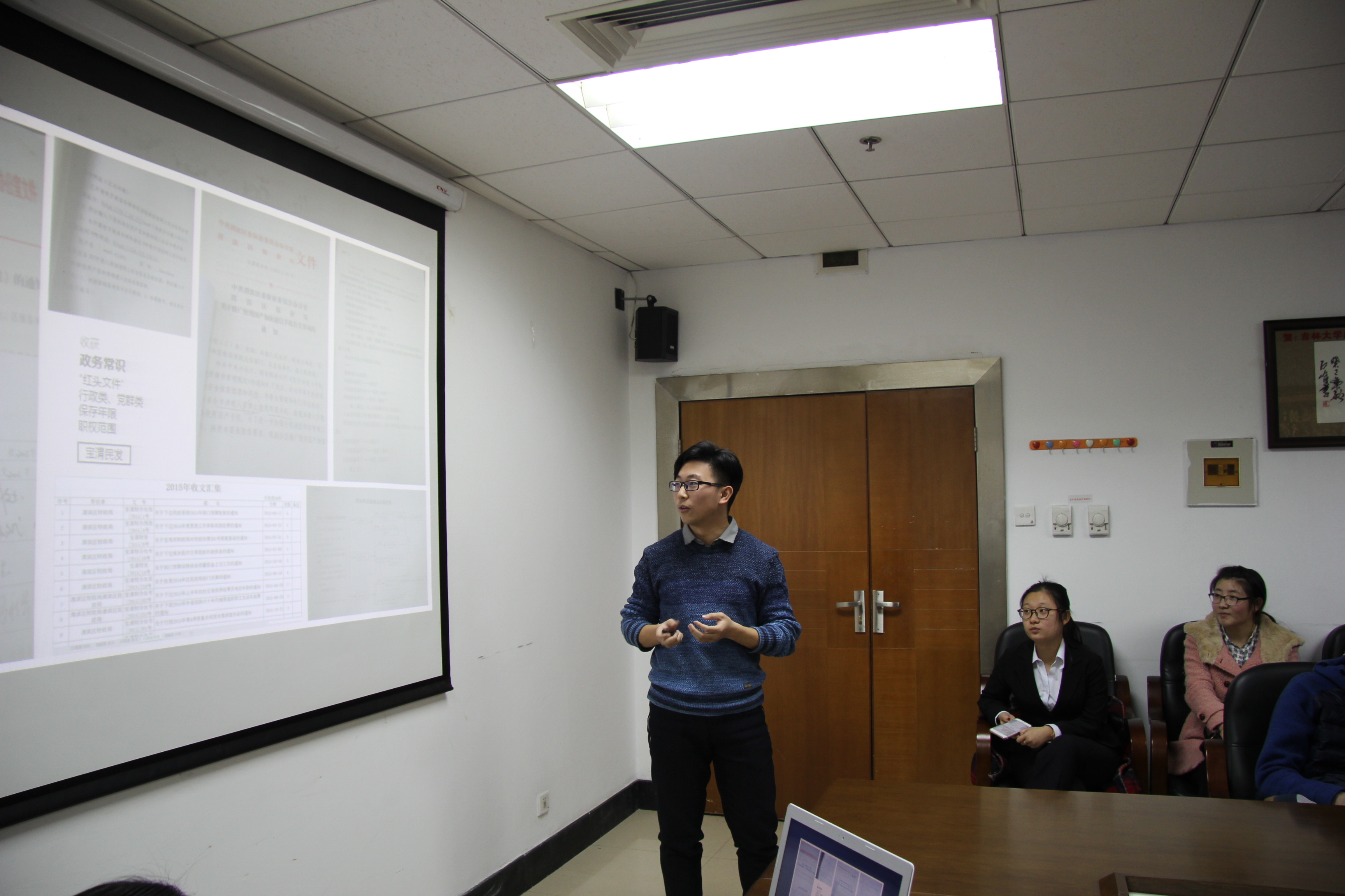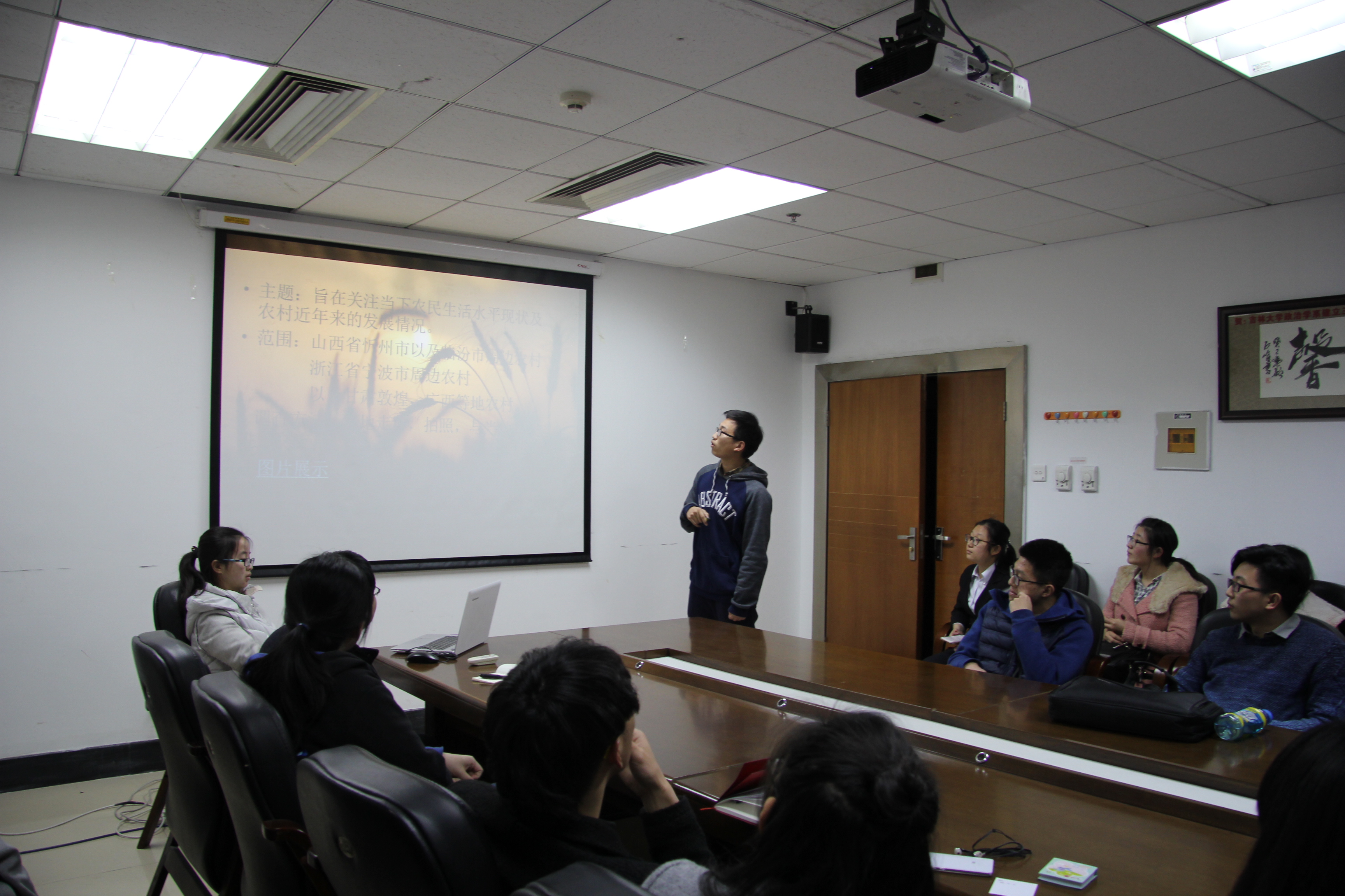 会议于下午六点正式开始。首先,曲畅竹进行讲话,对寒假期间同学们积极参与实践调研的精神表示赞赏,强调老员工要将专业知识与社会实践相结合。接下来共有九组成员分别展示了自己的实践成果。有六个小组关注了当前中国农村问题,他们从农村基层政治组织、经济发展、教育医疗等方面对农村居民的生活现状进行了较为全面的调查与分析,并针对相应问题提出了解决方案;另有两个小组分别在政府部门进行实习,实地地感受政府办公流程,亲身体验政府工作内容,用切身的实践来感受政府的行政方式;最后一个小组对当前的雾霾情况进行了调查、分析,并分别从政府与公民各自的职责方面进行总结并提出了建议。会议最后,孙超群对会议进行总结,对各组的实践成果给予了充分肯定,同时又在PPT制作与语言表达方面对各组成员提出建议。