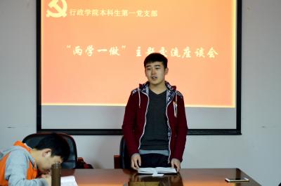 座谈会开始后,任建国先向与会人员传达了“两学一做”精神,安排了会议秩序并介绍了会议内容。首先进行的是本级党支部组织委员以及宣传委员的选举。选举以民主投票的方式进行,最终郝瑞琪和刘航宇分别以高票当选为2013级党支部组织委员和宣传委员。随后进行的主题交流,任建国首先讲述了自己这段时间学习党章、党史的感悟。他认为老员工党员要认清自己的身份,将为人民服务以及服从党的领导落实到具体实践中,老员工需要正确理解党的纲领与政府改革的关系,为实现中国梦做贡献。随后的自由发言中,党员孙诗琪率先发言。她认为我们老员工应该积极响应党中央的号召,用“三严三实”来规划自己,要帮助他人,争创先进,在党的领导下变得更优秀。之后,郝瑞琪、刘航宇等同学分别发表了自己的见解。最后任建国在总结发言时强调:入党是一件严肃的事情,当我们成为一名党员时,心中就应该有党、有人民;社会很复杂,但党员要时刻清醒,知道应该做什么,不该做什么;要努力学习,端正态度,认真学习党章党律。