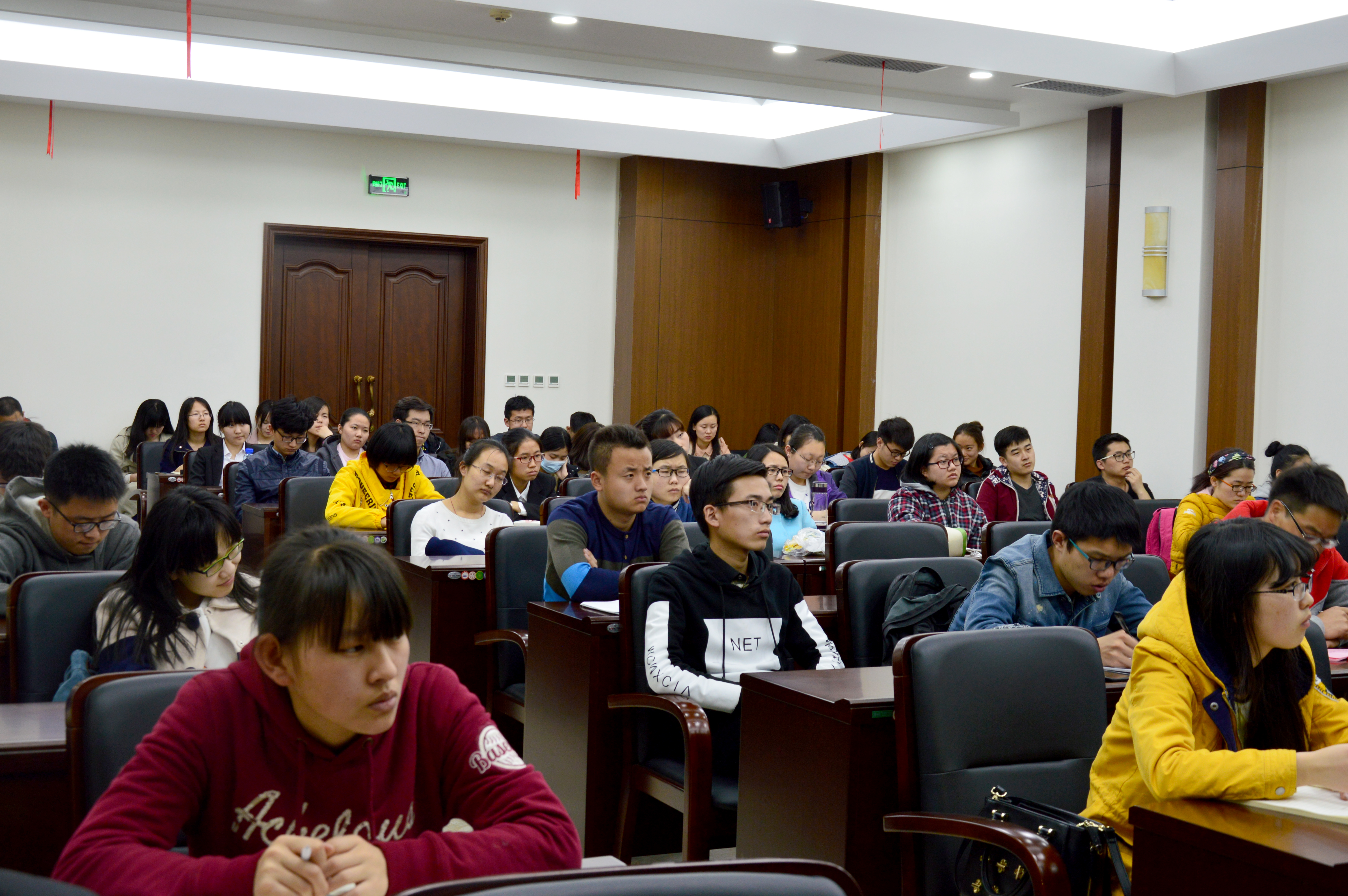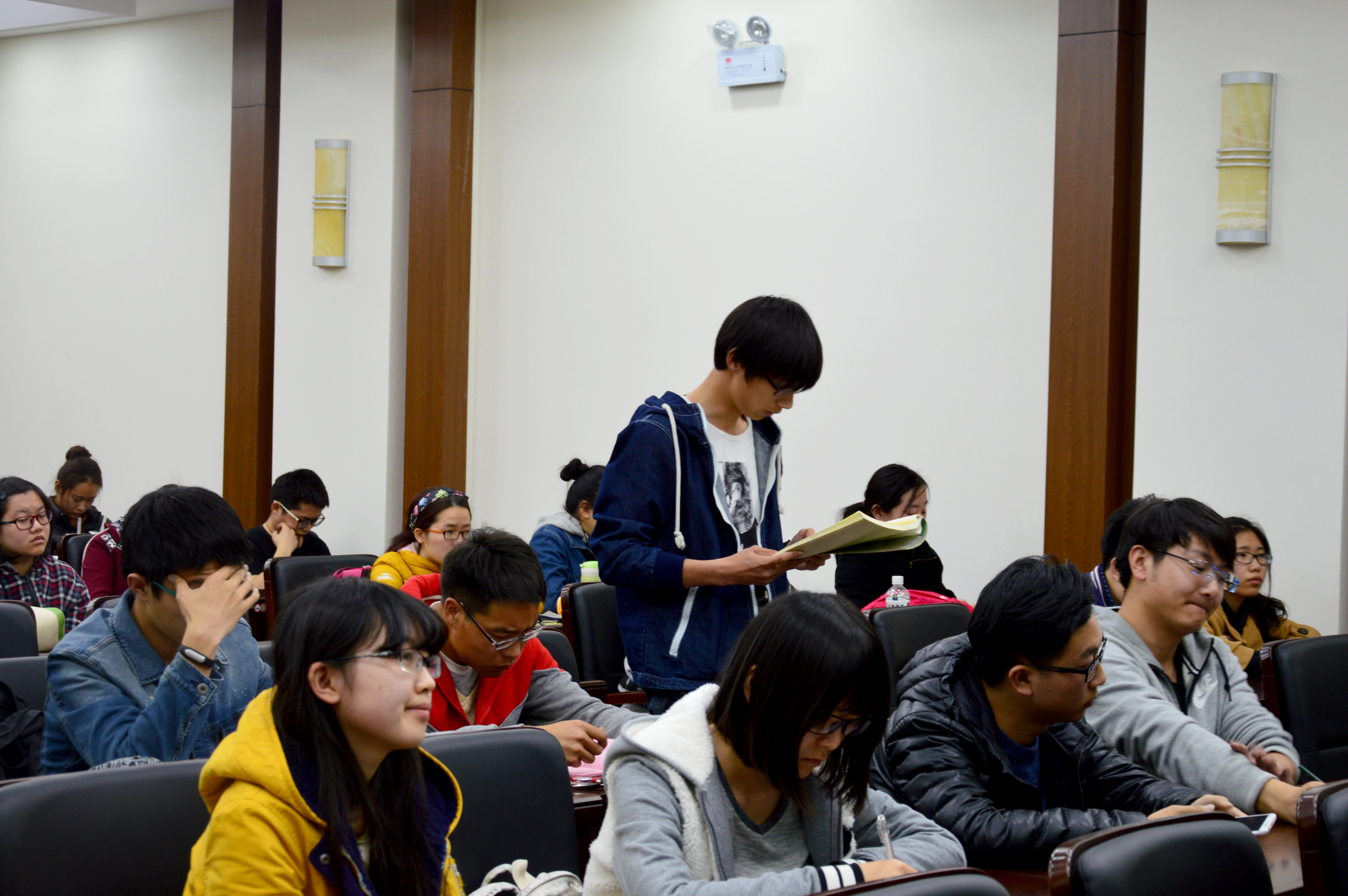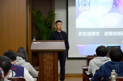 下午6时,讲座正式开始。于君博首先向出席活动的师生介绍了自己所做调查的汇报提纲,即通过研究背景、文献综述、研究设计、研究发现、研究启示五个模块详细介绍研究成果。在第一个模块中,于君博首先阐释了名校选调生的明确概念与出现原因,并指出我们应当充分重视选调生的出现及其背后蕴含的当代青年公共服务心态等社会问题。而在文献综述与研究设计模块中,他展示了自己及团队在研究初期进行的文献搜集和准备工作。本次调查活动采用问卷调查分析与半结构化访谈相结合的研究形式,同时他表示由于研究环境和条件的限制,本次调研仍存在研究视角单一、研究基础薄弱、研究方法粗糙等问题。最后,于君博重点介绍了调研活动的研究发现与启示,通过对回收问卷的效度分析与对访谈对象的有针对性的提问,他发现名校选调生普遍存在生活质量与工作环境等几个方面的差异,而选调政策的较大弹性、当代青年一代生活压力的增大、人职错配与官僚体系的恩庇关系等均是造成选调生幸福指数偏低的重要因素。但同时,于君博还指出尽管选调生目前就职情况较为严峻,但大部分选调生仍对未来持乐观态度,并坚信可以通过个人努力提高自身待遇与生活质量。在调研汇报结束后,于君博与在场员工针对本次讲座的内容进行了互动。同学们大胆提出了自己的困惑,其中涉及的恩庇制度与政治环境中关系网络的利弊探究、高薪养廉与名校人才待遇区别化等问题也引起了在场其他师生的深思。