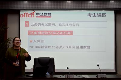 于晶主要是从四个部分来讲述2016年公务员备考策略。通过第一部分,于晶向我们阐述了为什么要报考公务员。她认为现今报考公务员的主要原因是公务员的工作比较稳定且生活质量相对较高。关于第二部分,于晶以吉林省公务员考试为例向我们论证了公务员考试的公正性并且简单的对公务员的职务进行分析。公务员考试主要包括笔试和面试两个环节,每个环节都以公正、公平以及公开为理念。关于公务员的职务,她主要从省级公务员、市级公务员和县级公务员三个方面进行讲解。在第三部分中,于晶向我们系统的介绍了笔试部分的内容。笔试包括两部分:行测和申论。其中,行测包括数学运算、推断推理、常识判断等题型;申论包括理论政策、思想表达、材料等内容,材料是其主体部分。在第四部分中,讲授了一定的解题技巧。以数学运算为例,于晶通过讲解历年公务员考试真题向我们展示了排除法、代入法、整除法、列表法等解题技巧。讲座结束后,为使同学们更为深入的了解备考指南,中公教育向同学们免费发放相关教材。