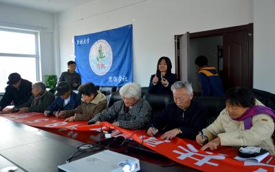 在经过细致周密地准备之后,研讨会在上午10点准时开始。首先,王佳佳用视频、幻灯片等资料对十八届五中全会背景、主题作了简单的介绍。随后的自由发言环节,大家各抒己见,分享自己对于全会的理解。其中2012级本科生万辰光用专业知识对全会公报中的五个发展(创新发展、协调发展、绿色发展、开放发展、共享发展)表达了深刻见解;2013级本科生赵赵德昊则从老员工的角度解读了五中全会公报,引起了在场的员工的普遍共鸣。之后,在场的东光社区老党员也表达了对于全会的独特见解。其中一位退休老教师就普及高中阶段教育的内容上谈到,对于建档立卡的家庭经济困难员工的学杂费免除和实现资助全覆盖,彰显了中央重视教育公平和惠民生的战略举措。研讨会结束之后,全体参会人员在活动条幅上签名留念。