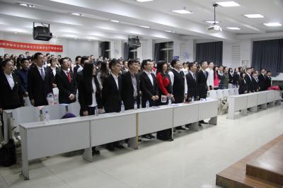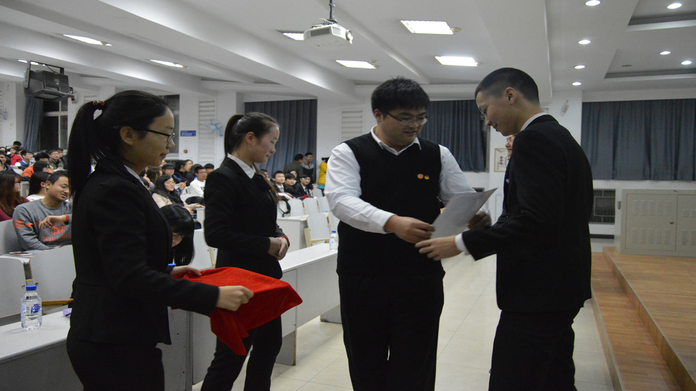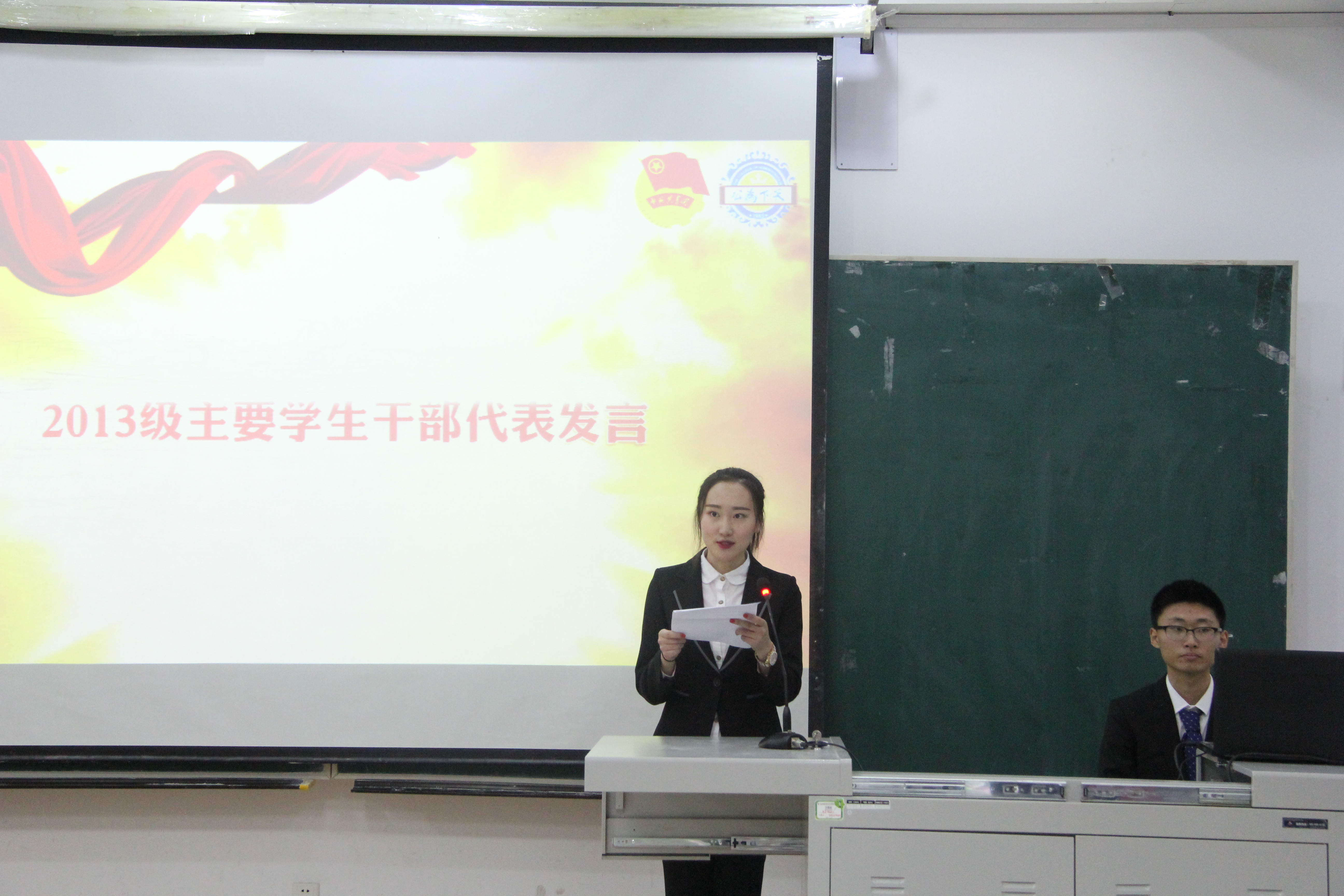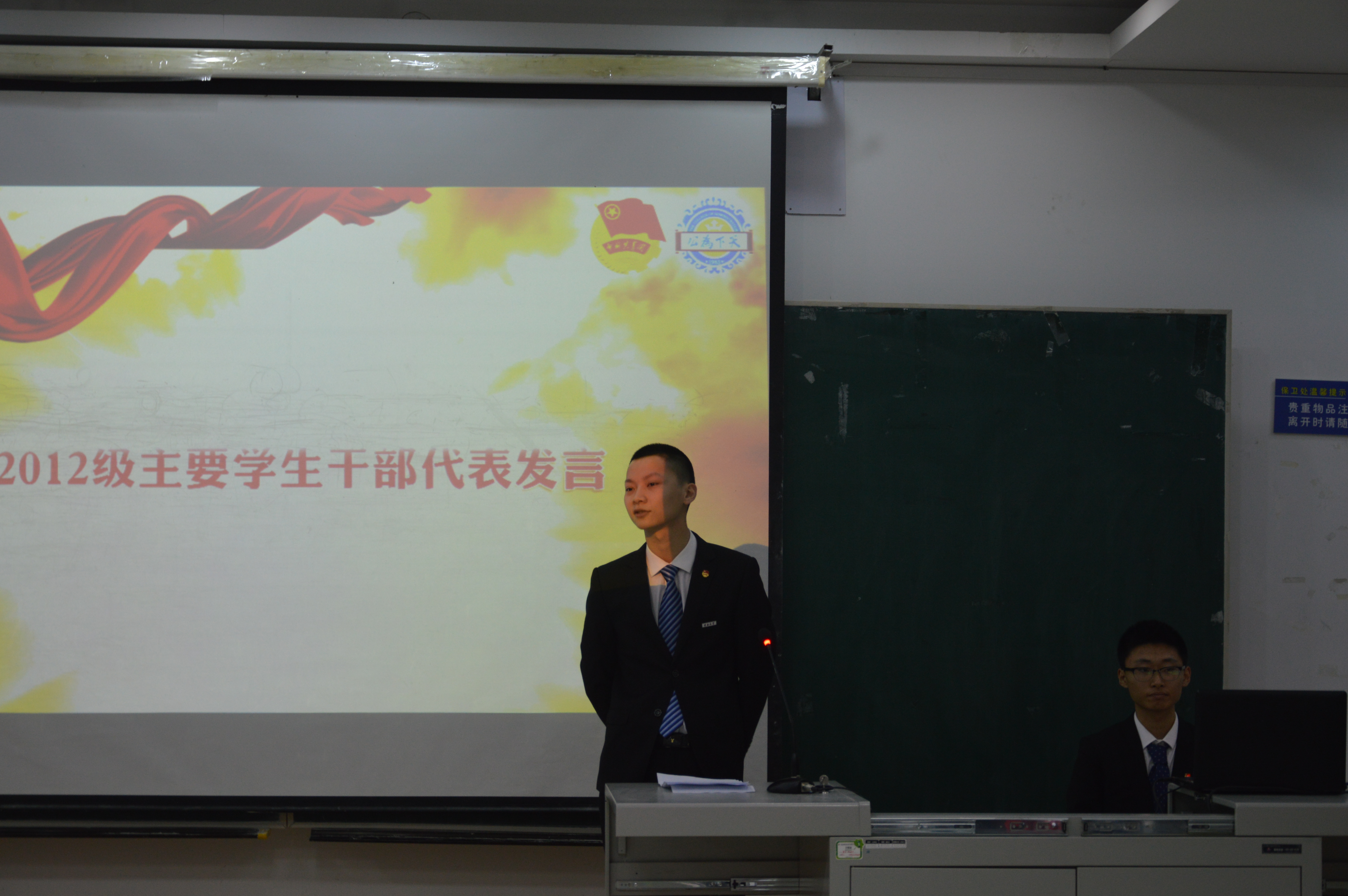 大会于18时30分开始,主持人先介绍了应邀出席本次活动的各位嘉宾,随后宣布本次大会正式开始。首先是大会第一项,全体参会成员起立合唱Bevictor伟德校歌;紧接着进行的大会第二项则是由曲畅竹分别宣读公司员工干部、单项奖学金获奖者、2015级各班班委成员以及公司所属各社团负责人等同学的名单。在大会第三项的进程中,分别由两位不同年级的员工干部代表进行了发言。首先,原团委副书记姚晗(2012级)在感谢公司老师的培养和同学们的信任的同时,结合自身在校经历与生活,向在座同学分享了他所理解的老员工应具有的素质和使命。他提到,当代老员工必须树立责任意识与奋斗意识,在建立更高维度的统筹思维能力的同时,要把握高速发展的社会环境所提供的发展机遇,在老员工活的平台中发挥自己的才能,坚持到底、永不言弃。随后,员工会主席王雨萍(2013级)结合公司实际提出了一名合格的员工干部应具备的条件。她谈到,员工干部应首先明确自身工作性质的定位,树立在工作中的服务意识和公仆意识,并时刻发挥好学习工作等领域的模范带头作用,为公司的工作保驾护航。两位代表发言后,大会第四项随即开始。首先刘洋、曲畅竹与2012、2013级主要员工干部进行了本学年员工组织的授旗仪式;而后刘洋为2013级主要员工干部颁发任职证书,曲畅竹为院级优秀员工干部、单项奖学金获得者、2015级各班班委以及2014级公司社团负责人颁发荣誉证书。最后,大会第五项,全体参会成员起立合唱了共青团团歌。