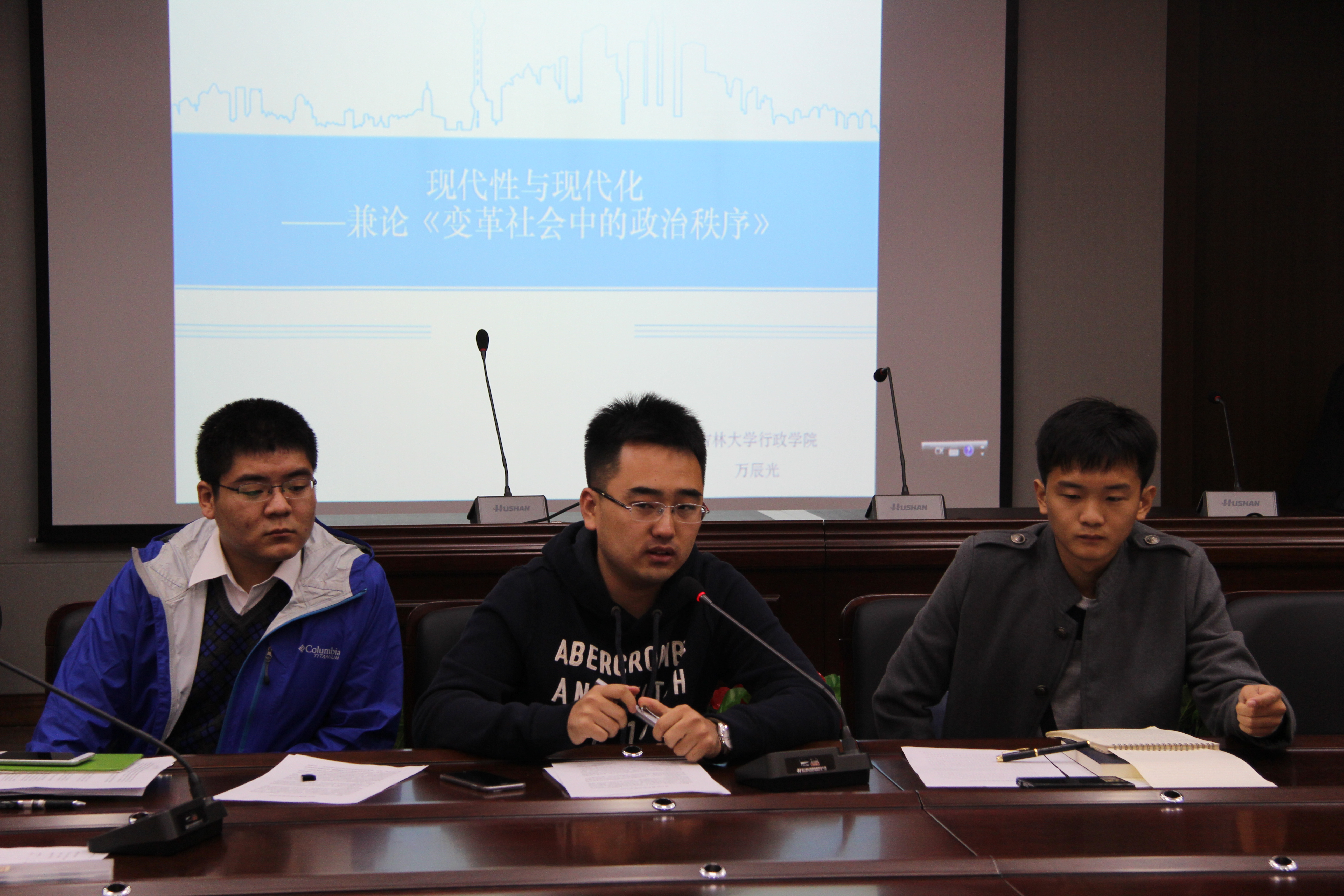 本次活动以塞缪尔·P·亨廷顿的学术著作《变革社会中的政治秩序》及其延伸的政治发展为议题展开讨论。活动中,赵德昊首先从政治制度化的必要条件,政治良好政党制度的形成与演进,政治制度化的重要属性等角度简要介绍了该著作核心内容。万辰光则以该书内容为切入点,以现代性与现代化的区别为主题深入剖析了公民社会与民主国家的必要产生条件及其内在联系,并在此基础上延伸至中国政治秩序现状的解读。张力伟在二人发言的基础上就政治发展的内涵界定,民主化与政体发展的必然性,社会自主性与政治文明的关联性等方面作出了更进一步的延伸说明。活动的最后,三位主讲人与参加活动的员工展开了自由讨论,共同思考了经济高度发展与政治民主化的关联,过度民主化政体导致的效率降低等问题。
