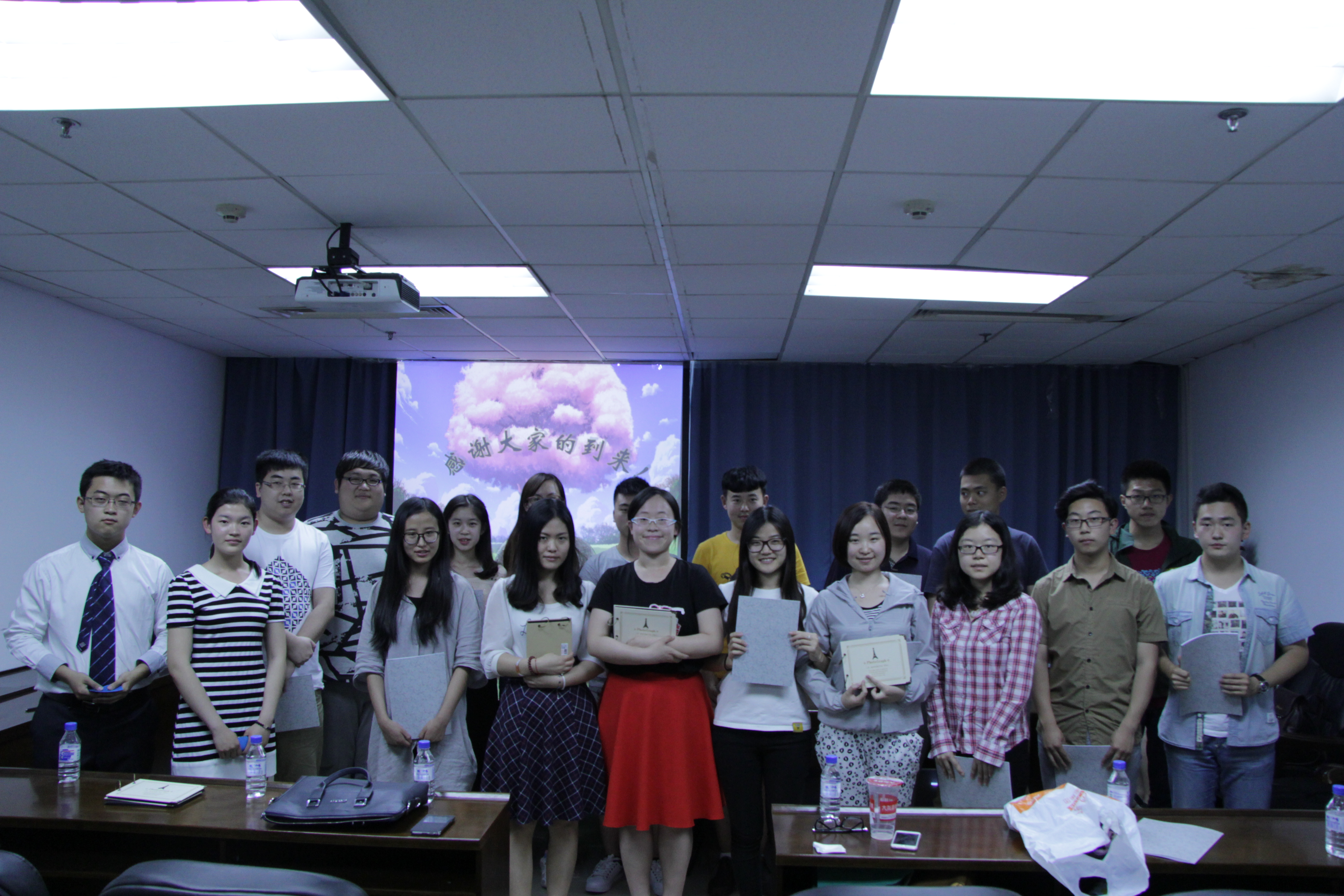 留学的毕业生代表首先介绍了一些关于出国留学的注意事项,讲述了其利弊和具体要求,分享了自己了解到的赴美赴欧留学的流程和细节。代表们尤其强调了英语的重要性。国内读研的毕业生代表则和大家分享自己保研和考研的经历,在学习方面为同学们提供了一些建议。他们强调考研最重要的在于坚持,应保持良好心态,积极备考应考。毕业生代表们用自己的亲身经历告诉大家,应充分珍惜大学四年时光,努力学习,提升自我能力。在提问环节,在场观众就留学要涉及的学位证、留学中介和考研需要用到的参考资料等问题咨询了毕业生代表,代表们对其进行了耐心详细地解答。活动最后,2011级六位优秀毕业生代表和2012、2013级班委代表互相赠送了礼物,大家合影留念。