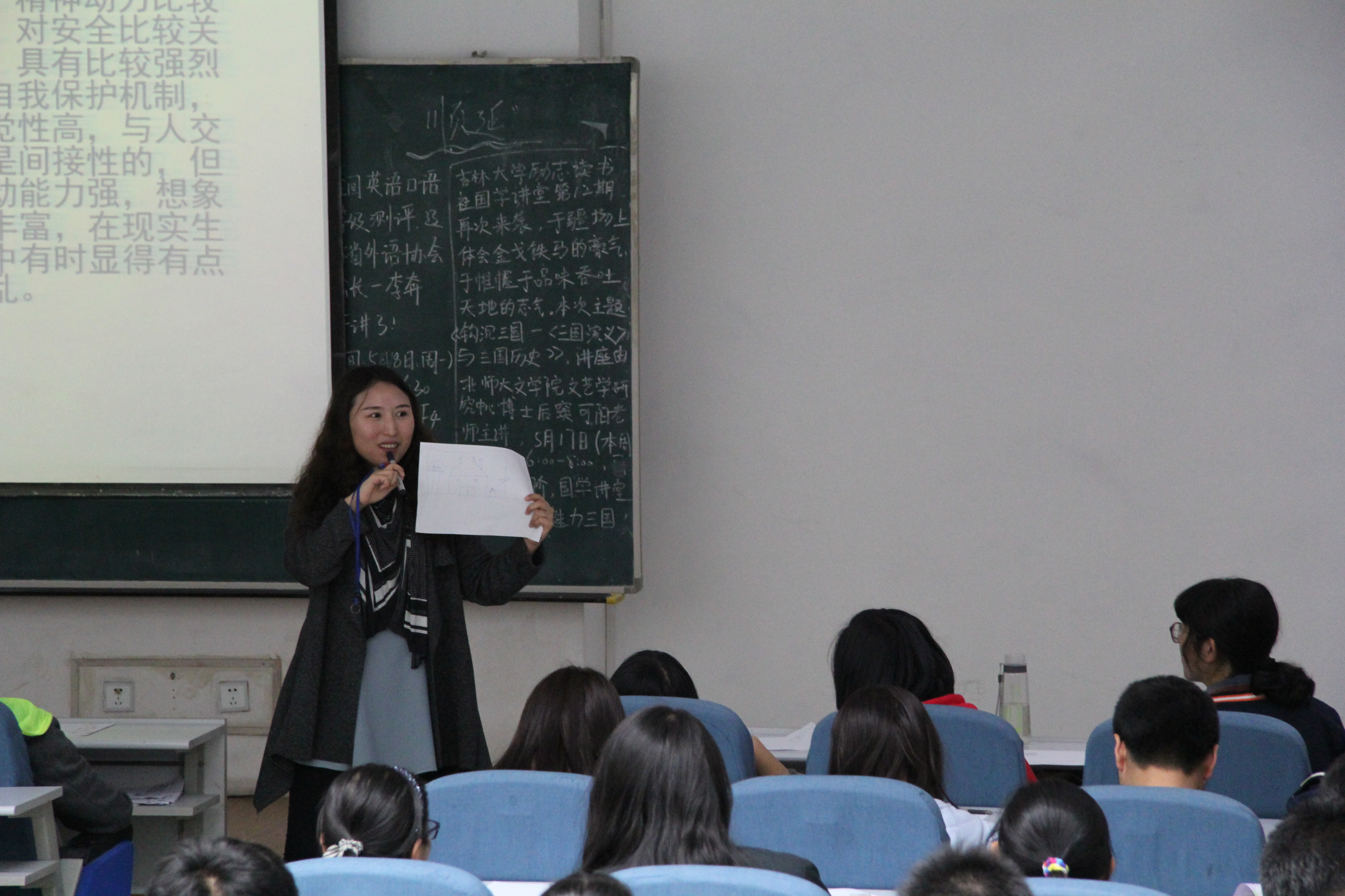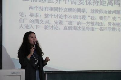 首先白仲琪将同学们分成八人一组的小组,组织大家做了 “房树人”投射测验,即根据画的内容来分析同学们的心理状况:房子代表家和归属感,其中的栅栏表示安全感,门窗表示人际间的沟通;树代表人的生命力,果实表示人生中出现重大事件的年龄;而人则是自我的现实反映。接下来小组同学共同完成了四个游戏——自我推销、巧成一句话、没有“我”、你说我画。通过这四个游戏,加深了小组成员间的了解,增强了同学们之间的默契与团结互助的能力,让同学们认识到在与人交往中不要过于自我,更要注重对方的感受。白仲琪在四个游戏的基础上给同学们开展了心理知识讲座。她强调心理危机的表现形式是性格改变、情绪改变,提醒同学们注意自己的心理变化。她指出,解决心理问题的正确做法是与人沟通、进行朋辈间的互助、去心理辅导室咨询等。最后白仲琪针对几个小组代表提出的问题进行了详细的解答。